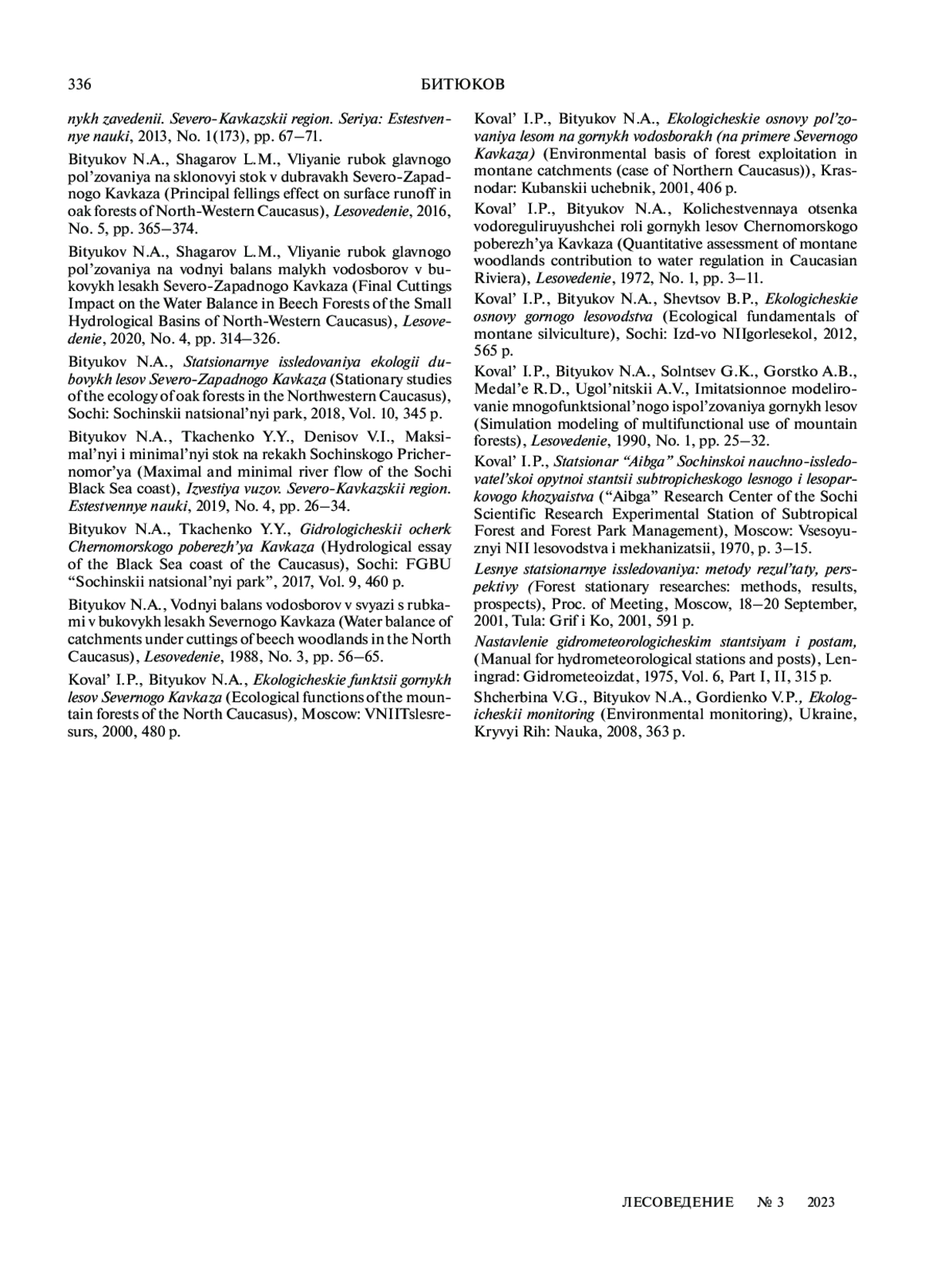 2. Битюков Н.А. Водный баланс водосборов в связи с рубками в буковых лесах Северо-Западного Кавказа // Лесоведение. 1988. № 3. С. 56–65.