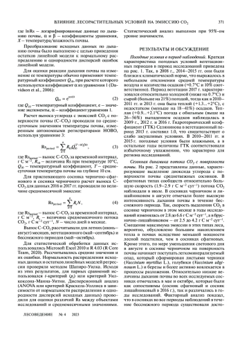 Эмиссия СО 2 (Rs) с поверхности почвы является крупнейшим потоком, обеспечивающим возврат диоксида углерода в атмосферу (BondLamberty, Thomson, 2010). Вместе с тем обобщенные оценки этого процесса характеризуются большими вариациями полученных значений как на региональном (Mukhortova et al., 2021), так и глобальном уровне (Hashimoto et al., 2015). Синтетический анализ, основанный на прямых измерениях дыхания почвы, был предложен как простое решение для глобальных расчетов потока СО2 (Sha et al., 2021). Для этих целей создаются базы данных, примерами которых являются материалы в работах (Mukhortova et al., 2020; Jian et al., 2021). Следовательно, накопление экспериментальных данных, поиск и верификация предикторов для оценки величины эмиссии СО2 с поверхности почв без прямых измерений продолжают оставаться актуальной задачей исследований (Jian et al., 2020)