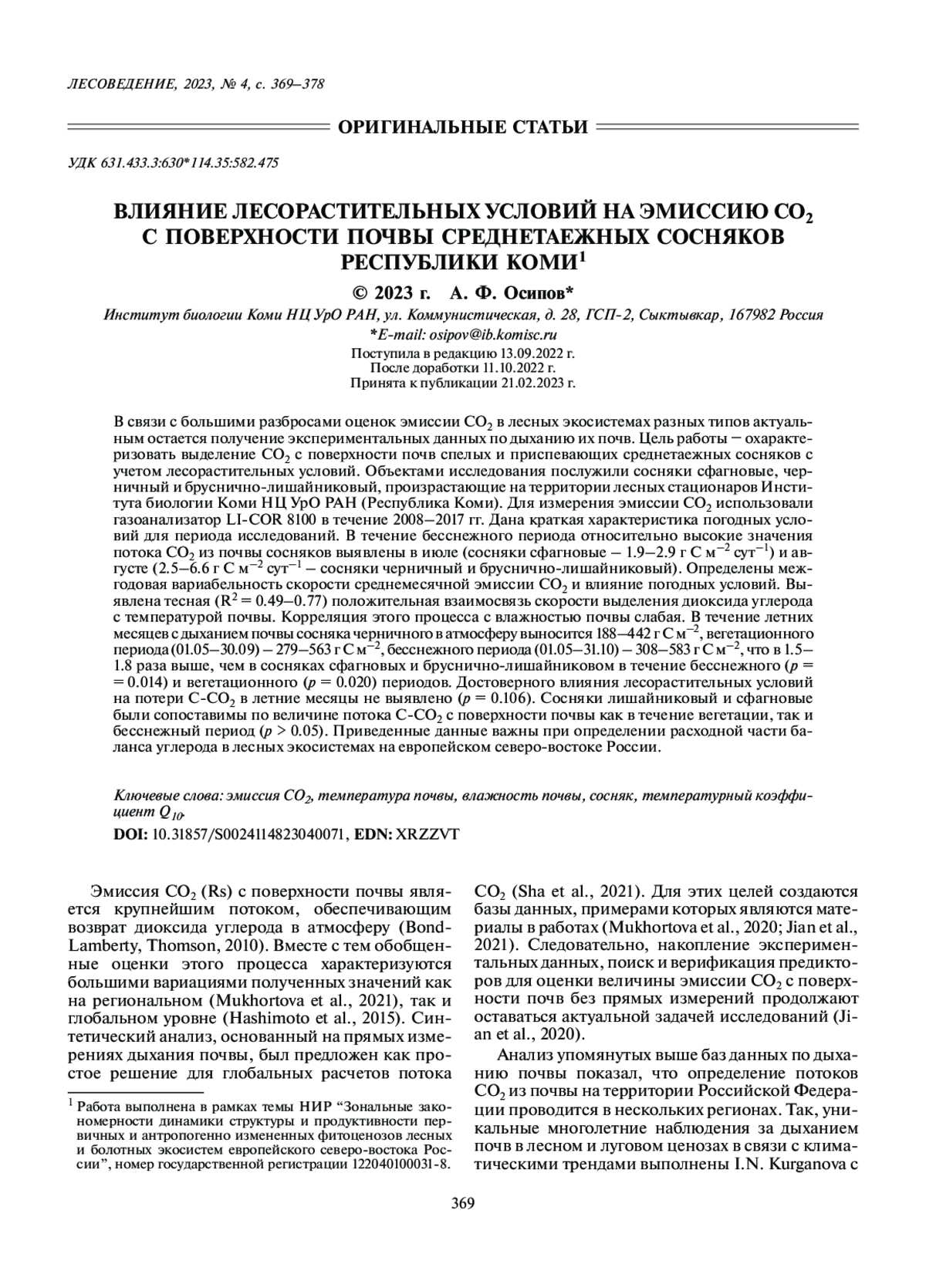 24. Osipov A.F. Effect of interannual difference in weather conditions of the growing season on the CO2 emission from the soil surface in the middle-taiga cowberry–lichen pine forest (Komi Republic) // Eurasian Soil Science. 2018. V. 51. № 12. P. 1419–1426. EDN: WUOIPD