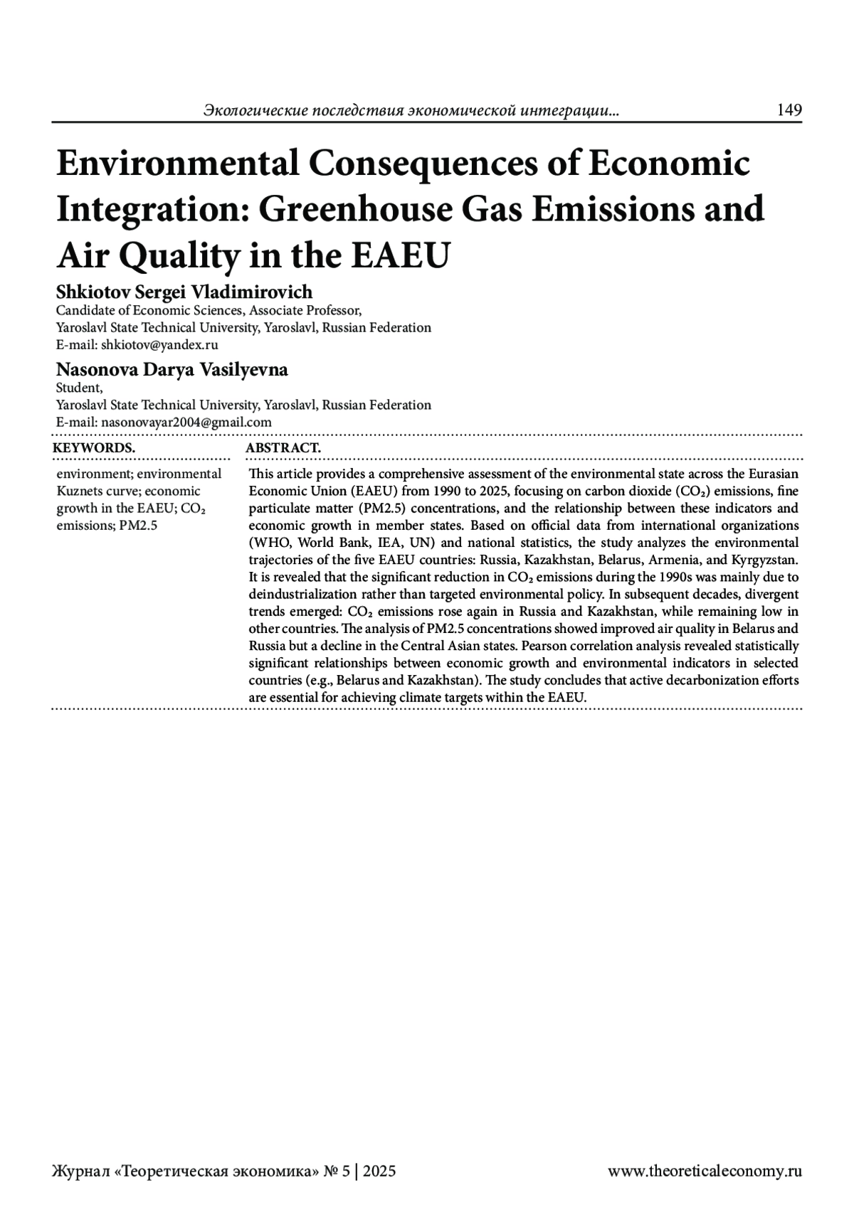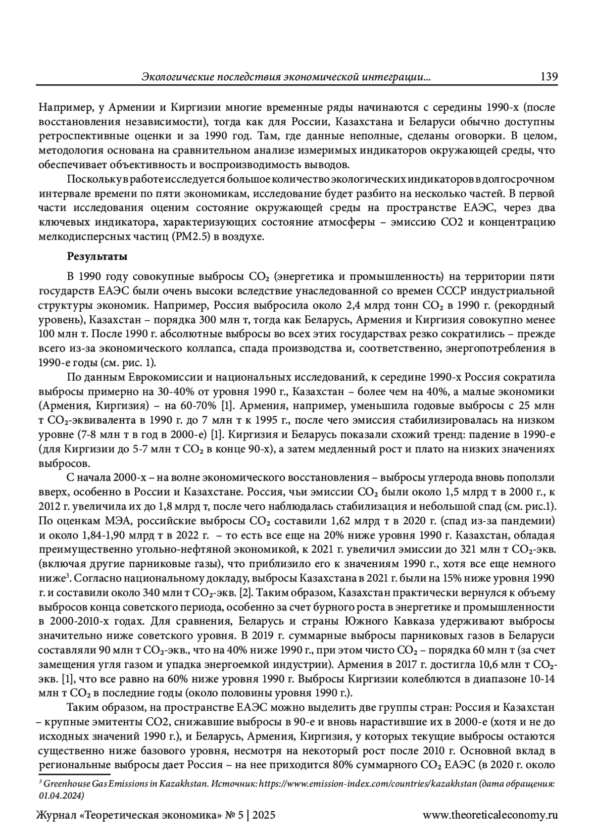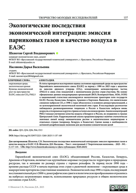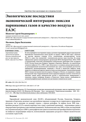 ШКИОТОВ С. В., НАСОНОВА Д. В. ЭКОЛОГИЧЕСКИЕ ПОСЛЕДСТВИЯ ЭКОНОМИЧЕСКОЙ ИНТЕГРАЦИИ: ЭМИССИЯ ПАРНИКОВЫХ ГАЗОВ И КАЧЕСТВО ВОЗДУХА В ЕАЭС // ТЕОРЕТИЧЕСКАЯ ЭКОНОМИКА. 2025. № 5 (125)
