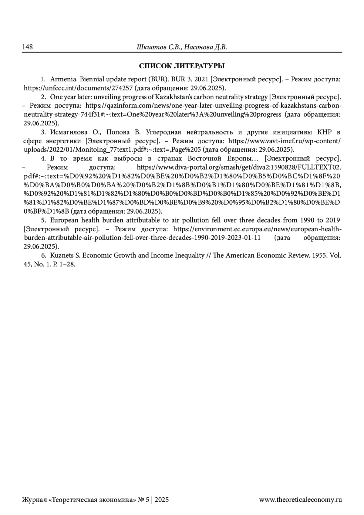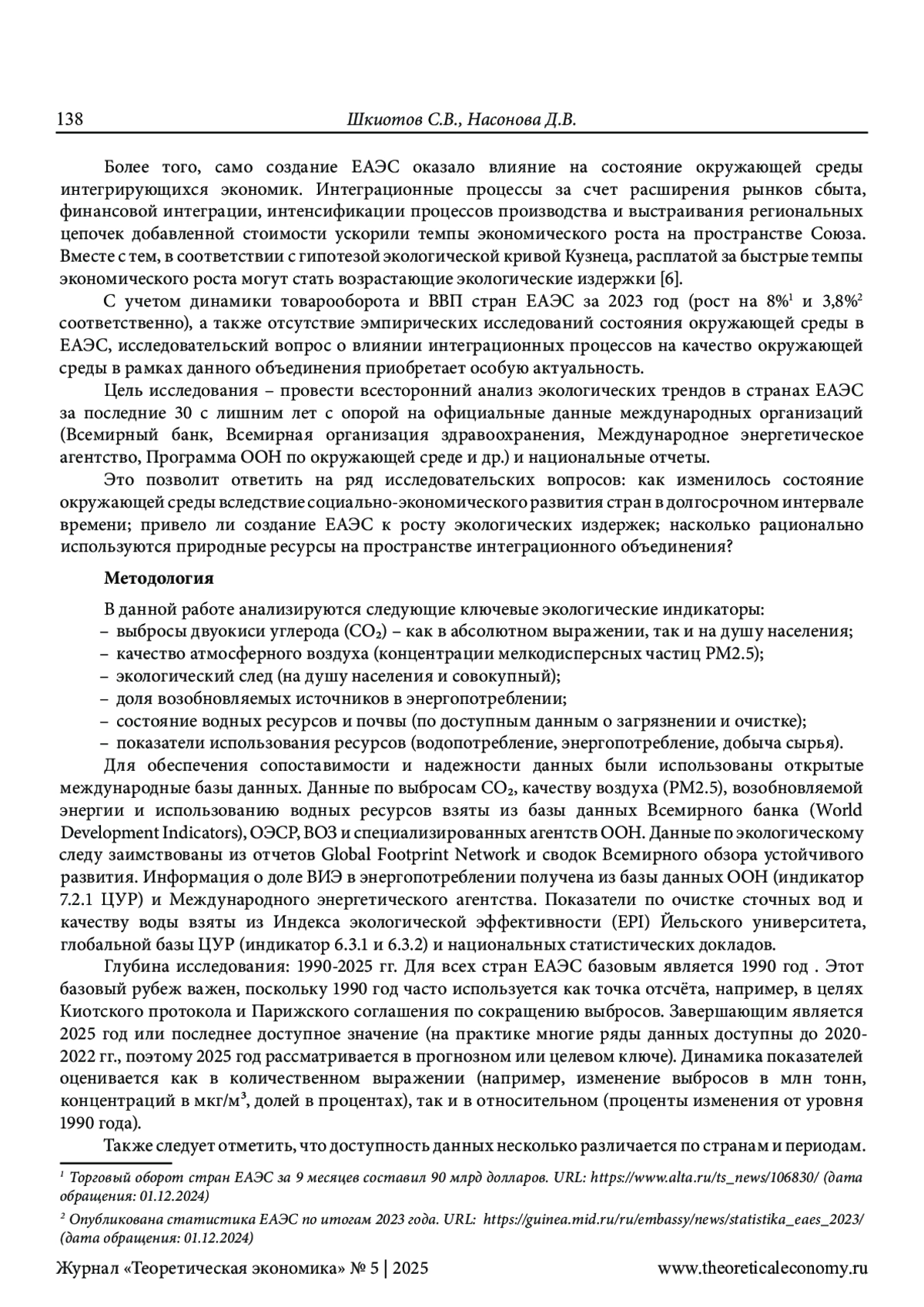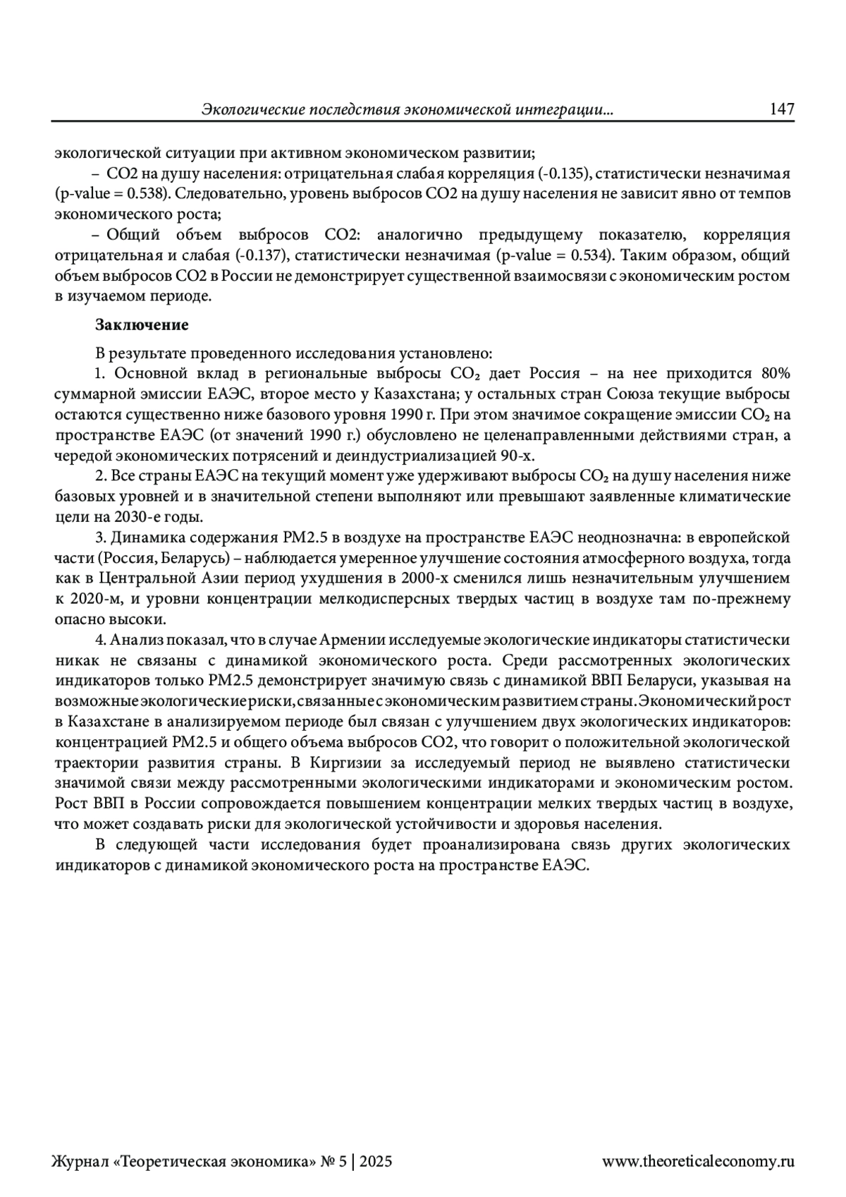 ШКИОТОВ С. В., НАСОНОВА Д. В. ЭКОЛОГИЧЕСКИЕ ПОСЛЕДСТВИЯ ЭКОНОМИЧЕСКОЙ ИНТЕГРАЦИИ: ЭМИССИЯ ПАРНИКОВЫХ ГАЗОВ И КАЧЕСТВО ВОЗДУХА В ЕАЭС // ТЕОРЕТИЧЕСКАЯ ЭКОНОМИКА. 2025. № 5 (125)