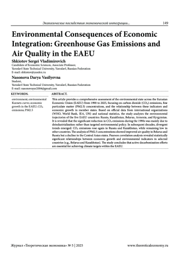Статья: ЭКОЛОГИЧЕСКИЕ ПОСЛЕДСТВИЯ ЭКОНОМИЧЕСКОЙ ИНТЕГРАЦИИ: ЭМИССИЯ ПАРНИКОВЫХ ГАЗОВ И КАЧЕСТВО ВОЗДУХА В ЕАЭС (2025)