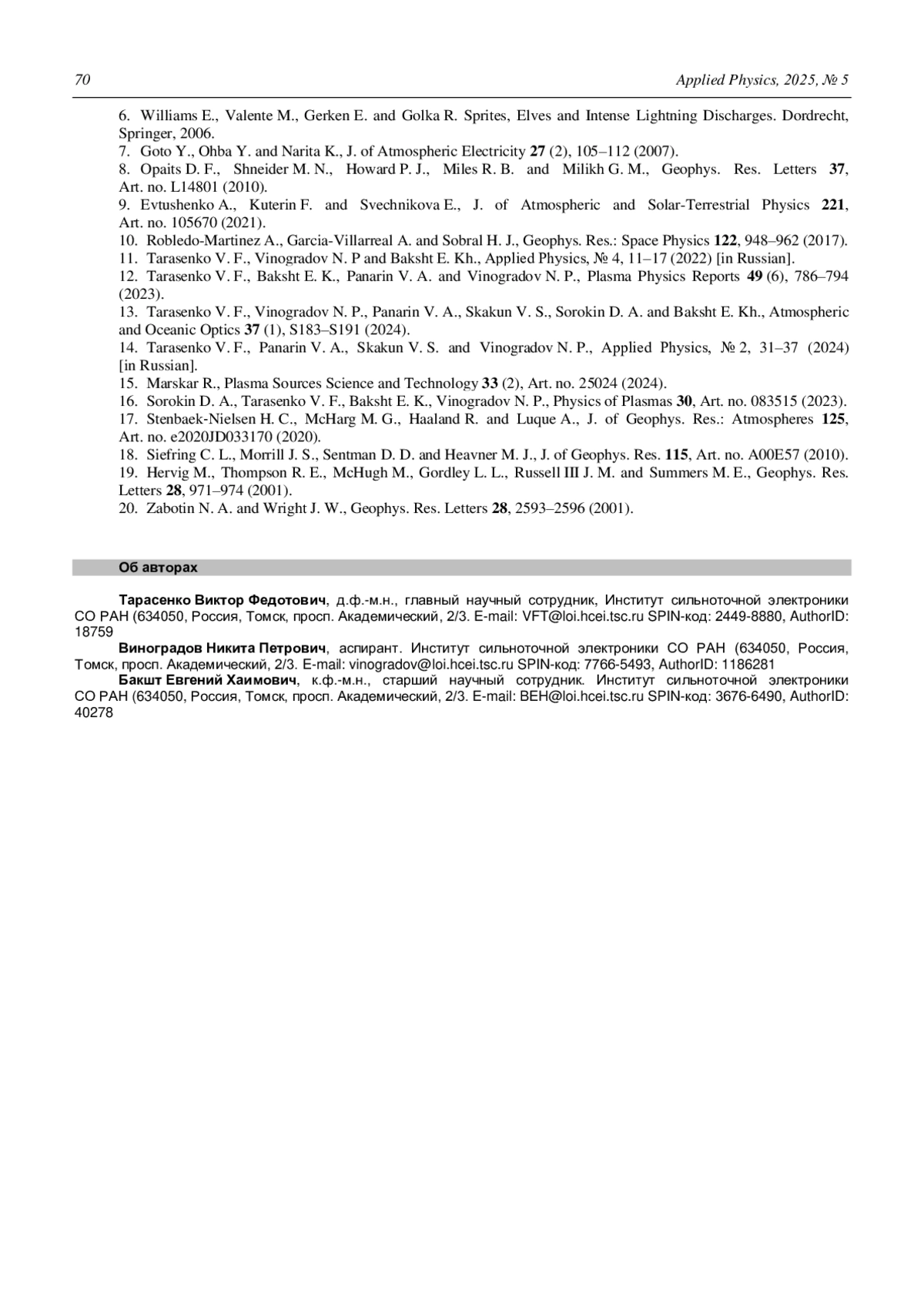 - Sorokin D. A., Tarasenko V. F., Baksht E. K., Vinogradov N. P. / Physics of Plasmas. 2023. Vol. 30. Art. no. 083515.