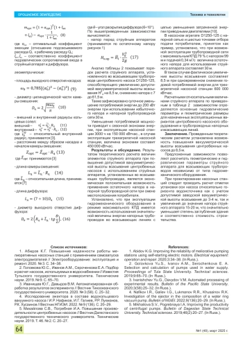 Теоретический расчет величины повышения вакууметрической высоты всасывания гидромеханического оборудования при использовании струйных аппаратов на всасывающих трубопроводах заключается в определении гидравлических и геометрических параметров кольцевого двухповерхностного струйного энергоэффективного аппарата, установленного на всасывающем трубопроводе центробежного насоса. Теоретически доказано наличие остаточного напора и подачи в сети при изменении местоположения потребителя на примере с насосом D1250-125. Определена величина максимального остаточного напора HH = 100 м и подачи 0,36 м3/с, по которой проведен расчет элементов струйного аппарата. К гидравлическим параметрам отнесены оптимальный коэффициент эжекции – отношение подсасываемого расхода к рабочему, скорость истечения из сопла, КПД, напор. Приведена зависимость для определения критического кавитационного режима. По геометрическим размерам рассмотрены площадь выходного сечения насадка, диаметр цилиндрической части камеры смешения, внешний и внутренний радиусы кольцевых сопел, расстояние между обрезом сопла и началом камеры смешения, длина и диаметр выходного отверстия диффузора. Расчетные относительные значения приведены в таблице, анализ которой допускает возможность увеличения допустимой вакууметрической высоты всасывания на 8,5 м и суточное уменьшение потребляемой энергии до 200 кВт. В соответствии с проведенным теоретическим расчетом установлена возможность повышения вакууметрической высоты всасывания центробежных насосов до 8,5 м. Предложенные зависимости позволяют рассчитать геометрические и гидравлические параметры струйного аппарата для всасывающих трубопроводов независимо от типа гидромеханического оборудования. При проектировании насосных станций следует проводить расчет отметки установки оси насоса относительно горизонта водоисточника как с учетом допустимой заводской вакууметрической высоты всасывания до 3-4 м, так и увеличений до значения напора струйного аппарата 15-20 м, что значительно уменьшает степень заглубления здания и соответственно стоимость строительства.