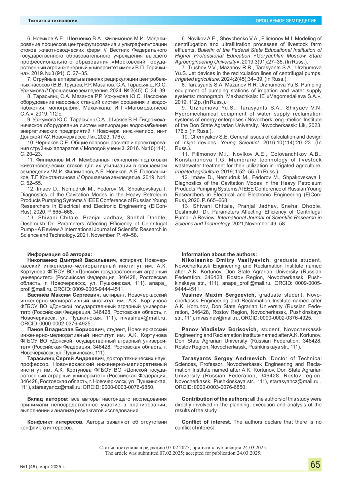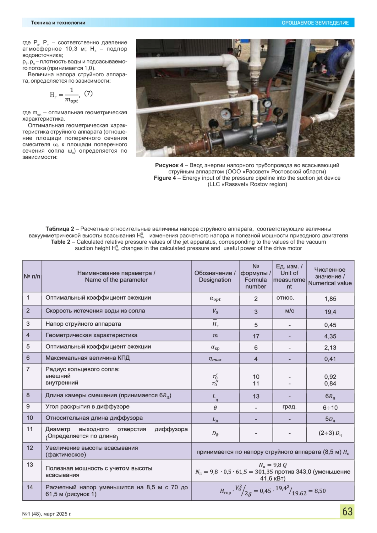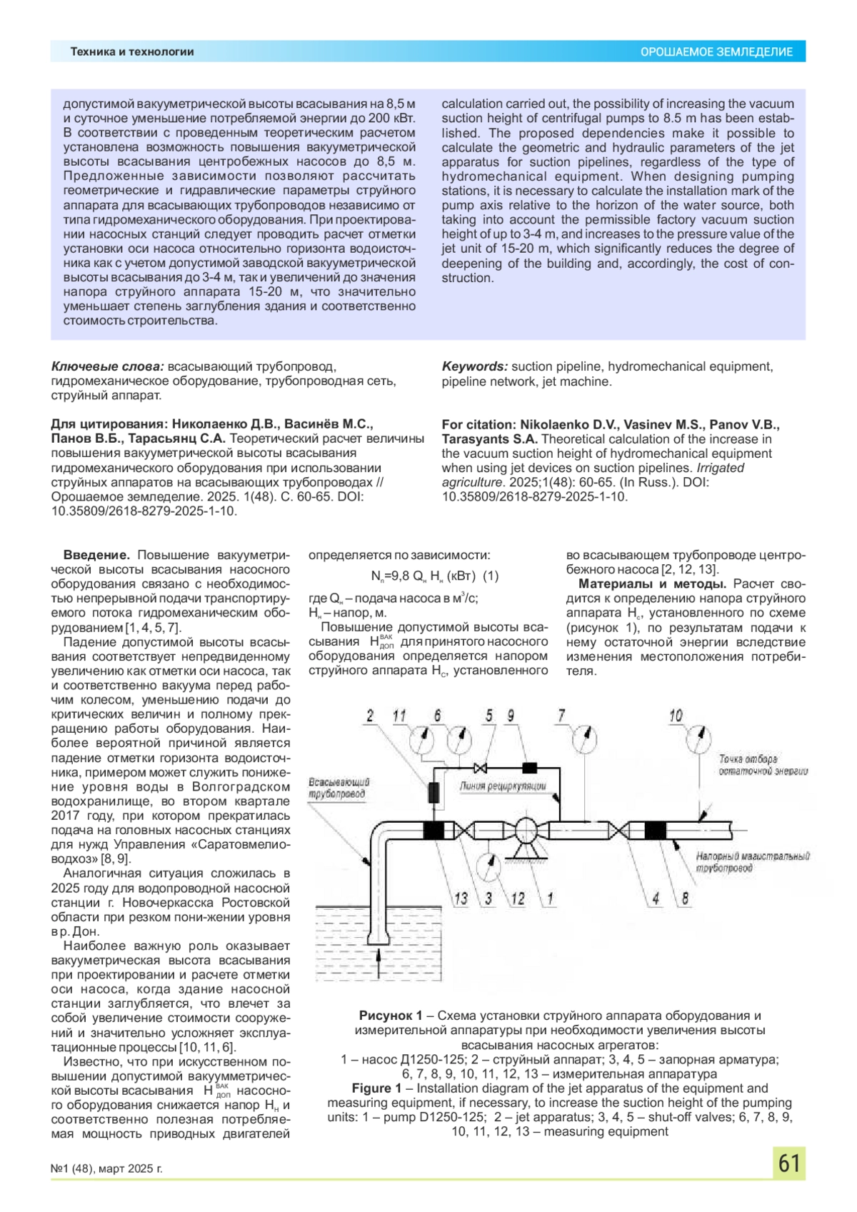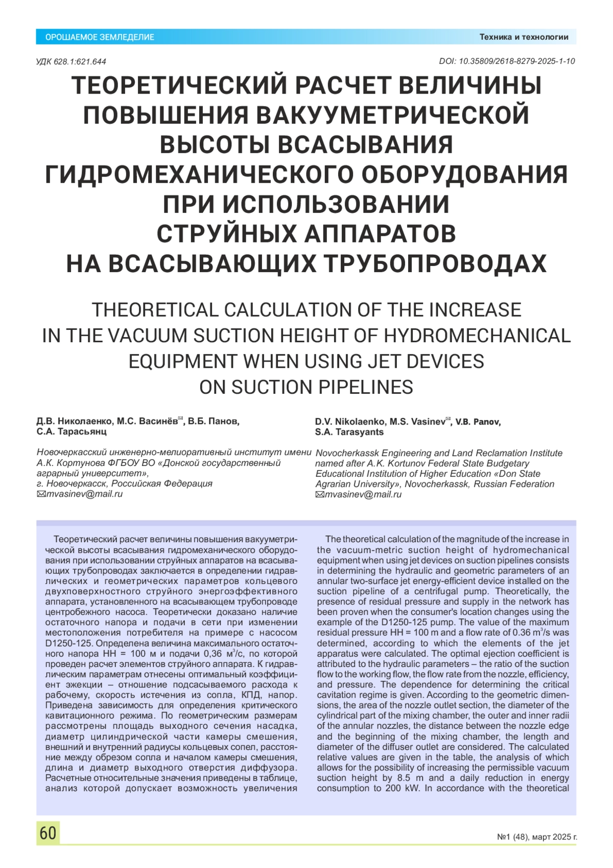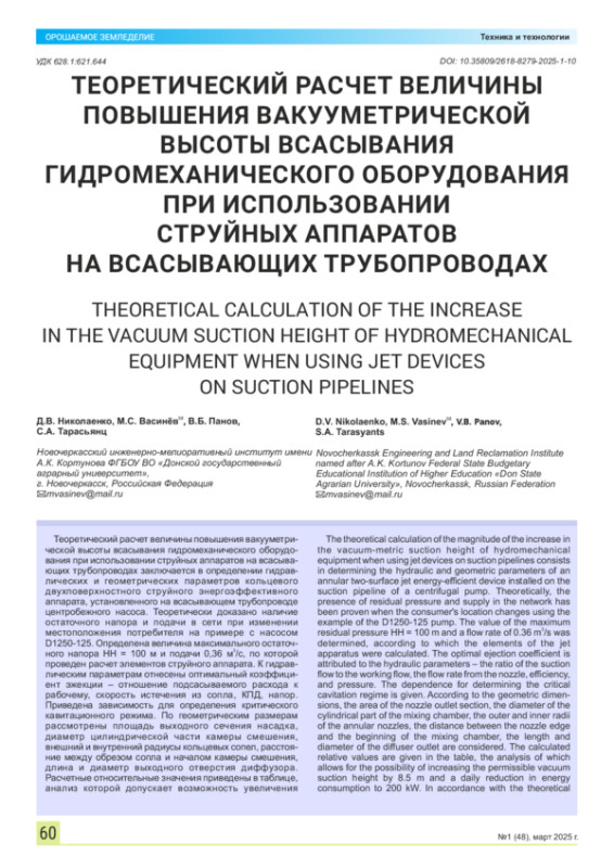 НИКОЛАЕНКО Д. В., ВАСИНЁВ М. С., ПАНОВ В. Б., ТАРАСЬЯНЦ С. А. ТЕОРЕТИЧЕСКИЙ РАСЧЕТ ВЕЛИЧИНЫ ПОВЫШЕНИЯ ВАКУУМЕТРИЧЕСКОЙ ВЫСОТЫ ВСАСЫВАНИЯ ГИДРОМЕХАНИЧЕСКОГО ОБОРУДОВАНИЯ ПРИ ИСПОЛЬЗОВАНИИ СТРУЙНЫХ АППАРАТОВ НА ВСАСЫВАЮЩИХ ТРУБОПРОВОДАХ // ОРОШАЕМОЕ ЗЕМЛЕДЕЛИЕ. 2025. № 1 (48)