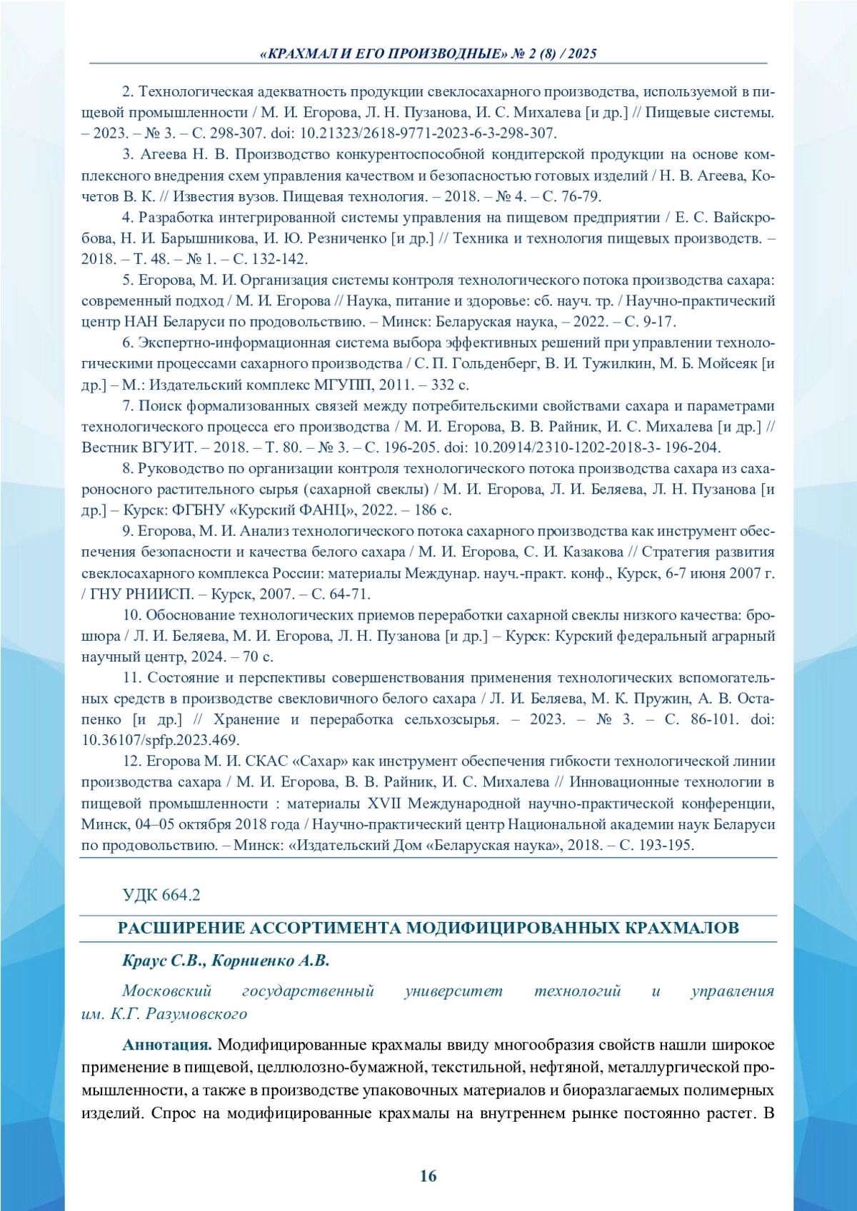 11. Состояние и перспективы совершенствования применения технологических вспомогательных средств в производстве свекловичного белого сахара / Л. И. Беляева, М. К. Пружин, А. В. Остапенко [и др.] // Хранение и переработка сельхозсырья. - 2023. - № 3. - С. 86-101. DOI: 10.36107/spfp.2023.469