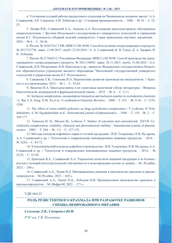 33. Малютенкова С. М. Природные резистентные крахмалы для производства пищевых продуктов с функциональными свойствами / Малютенкова С. М. // Сборник научных статей 13-й Международной научно - практической конференции “Актуальные проблемы международных отношений в условиях формирования мультиполярного мира”. - 2024. - С. 103-106.