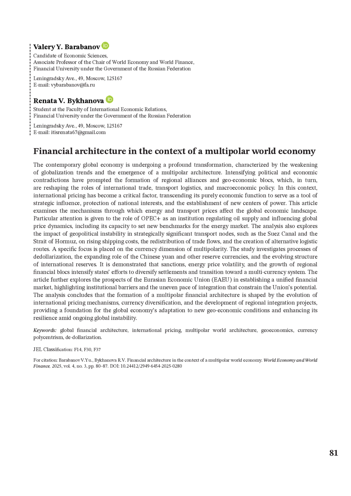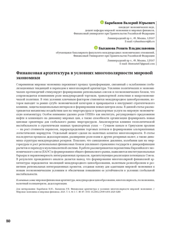 Современная мировая экономика переживает процесс трансформации, связанный с ослаблением глобализационных тенденций и переходом к многополярной архитектуре. Усиление политических и экономических противоречий стимулирует формирование региональных союзов и геоэкономических блоков, что сопровождается изменением роли международной торговли, транспортной логистики и макроэкономической политики. В этих условиях ключевым фактором становится международное ценообразование, которое выходит за рамки сугубо экономической категории и превращается в инструмент стратегического влияния, защиты национальных интересов и формирования новых центров силы. В данной статье рассматриваются механизмы воздействия цен на энергоресурсы и транспортные услуги на мировую экономическую конъюнктуру. Особое внимание уделено роли ОПЕК+ как института, регулирующего предложение нефти и влияющего на динамику мировых цен, а также способности организации формировать новые ценовые ориентиры для глобального рынка энергоресурсов. Анализируется влияние геополитической нестабильности в стратегически важных транспортных узлах — Суэцком канале и Ормузском проливе — на рост стоимости перевозок, перераспределение торговых потоков и формирование альтернативных логистических маршрутов. Отдельный акцент сделан на валютных аспектах многополярности. В статье исследуются процессы дедолларизации, расширение роли юаня и других резервных валют, а также динамика структуры международных резервов. Показано, что санкционное давление, колебания цен на энергоресурсы и рост региональных финансовых блоков усиливают стремление государств к диверсификации расчетов и переходу к мультивалютной системе. В работе рассматриваются перспективы Евразийского экономического союза (ЕАЭС) в формировании общего финансового рынка, выявляются институциональные барьеры и неравномерность интеграционных процессов, препятствующие реализации потенциала Союза. В результате проведенного анализа делается вывод, что формирование многополярной финансовой архитектуры определяется эволюцией международного ценообразования, валютным разнообразием и развитием региональных интеграционных проектов, создавая основу для адаптации мировой экономики к новым геоэкономическим условиям и обеспечивая повышение ее устойчивости в условиях глобальной нестабильности.