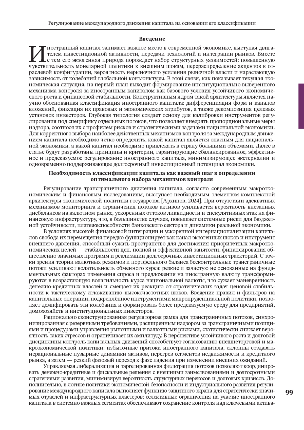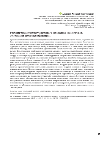 В работе систематизируется классификация иностранного капитала как ключевого этапа в разработке наиболее результативных и воспроизводимых механизмов макропруденциального контроля. В фокусе внимания находятся институциональные конфигурации и правовые формы трансграничного капитала, их структурные эффекты на финансовую и макроэкономическую устойчивость, а также спектр действующих регуляторных инструментов с оценкой их адаптивности и масштабируемости. Цель исследования заключается в формализации и унификации признаков иностранного капитала, идентификации его риск-профиля и потенциала для стимулирования долгосрочного роста через интегрированную регуляторную архитектуру, включающую профилактические, корректирующие и контрциклические элементы. Рассмотрены взаимосвязи между критериями классификации иностранного капитала и наиболее подходящих механизмов контроля за ним. Статья ставит своей задачей критический анализ существующих типов иностранных инвестиций по параметрам ликвидности, направленности инвестиций и степени корпоративного и бенефициарного контроля; установление причинно-следственных и корреляционных связей между формами капитала и результативностью контрольных механизмов в разрезе издержек комплаенса и предотвращения системных шоков. Методологически исследование опирается на сравнительный анализ международных практик, верифицируемые теоретические модели финансового сектора и эмпирические панели по динамике трансграничных вложений и метрикам регуляторной эффективности, с применением инструментов эконометрики для повышения внутренней и внешней валидности выводов. Научная и прикладная значимость работы обусловлена потребностью в переходе к системному, структурному пониманию роли иностранного капитала в экономическом развитии и в формировании доказательно обоснованных механизмов контроля, способных повышать устойчивость финансовых рынков, снижать уязвимость к непредвиденным дестабилизирующим шокам и поддерживать траекторию устойчивого, инклюзивного долгосрочного роста.