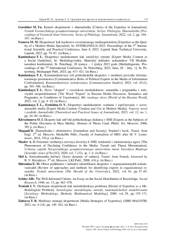 4. Иванова М. М. Экспертность как качество современного медиаспециалиста // INTERLINGUA-2023: Сб. науч. тр. III Междунар. науч.-практ. конф. Липецк, 2023. С. 79-87.