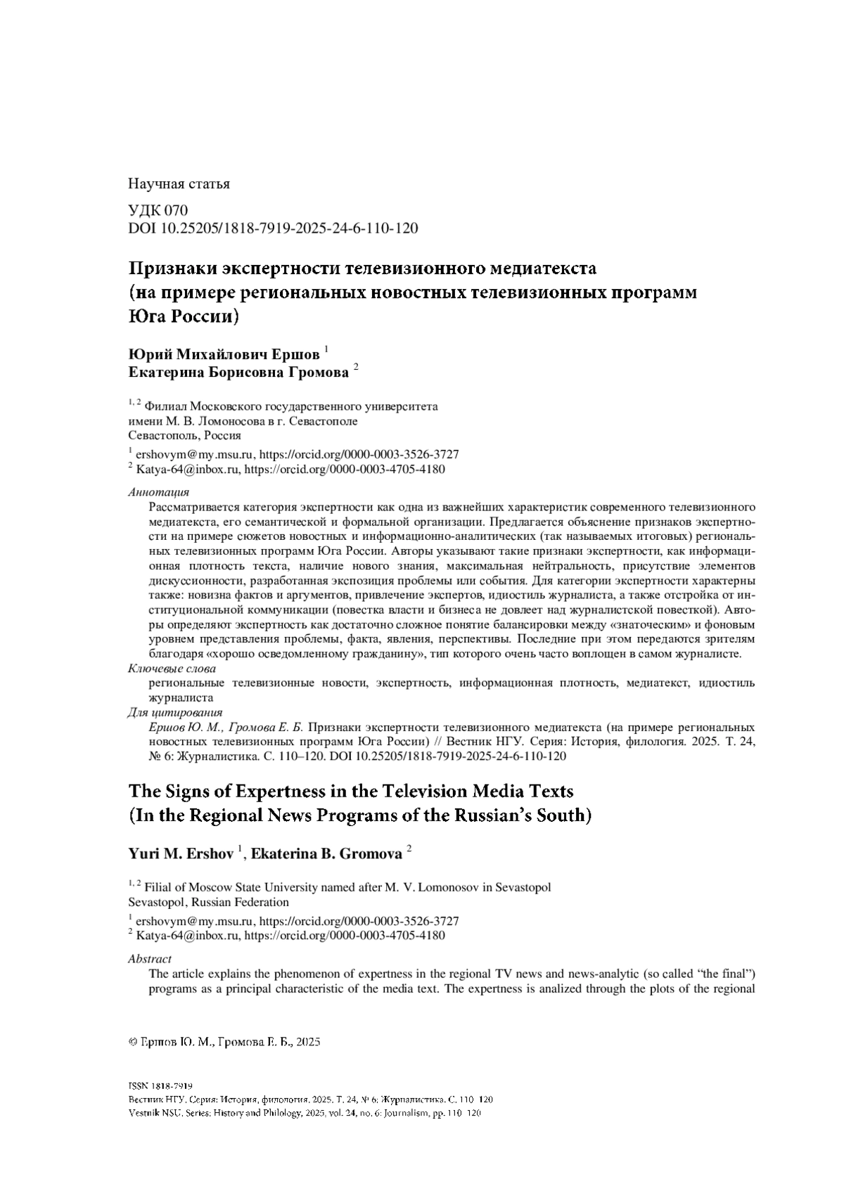 Рассматривается категория экспертности как одна из важнейших характеристик современного телевизионного медиатекста, его семантической и формальной организации. Предлагается объяснение признаков экспертности на примере сюжетов новостных и информационно-аналитических (так называемых итоговых) региональных телевизионных программ Юга России. Авторы указывают такие признаки экспертности, как информационная плотность текста, наличие нового знания, максимальная нейтральность, присутствие элементов дискуссионности, разработанная экспозиция проблемы или события. Для категории экспертности характерны также: новизна фактов и аргументов, привлечение экспертов, идиостиль журналиста, а также отстройка от институциональной коммуникации (повестка власти и бизнеса не довлеет над журналистской повесткой). Авторы определяют экспертность как достаточно сложное понятие балансировки между «знаточеским» и фоновым уровнем представления проблемы, факта, явления, перспективы. Последние при этом передаются зрителям благодаря «хорошо осведомленному гражданину», тип которого очень часто воплощен в самом журналисте.