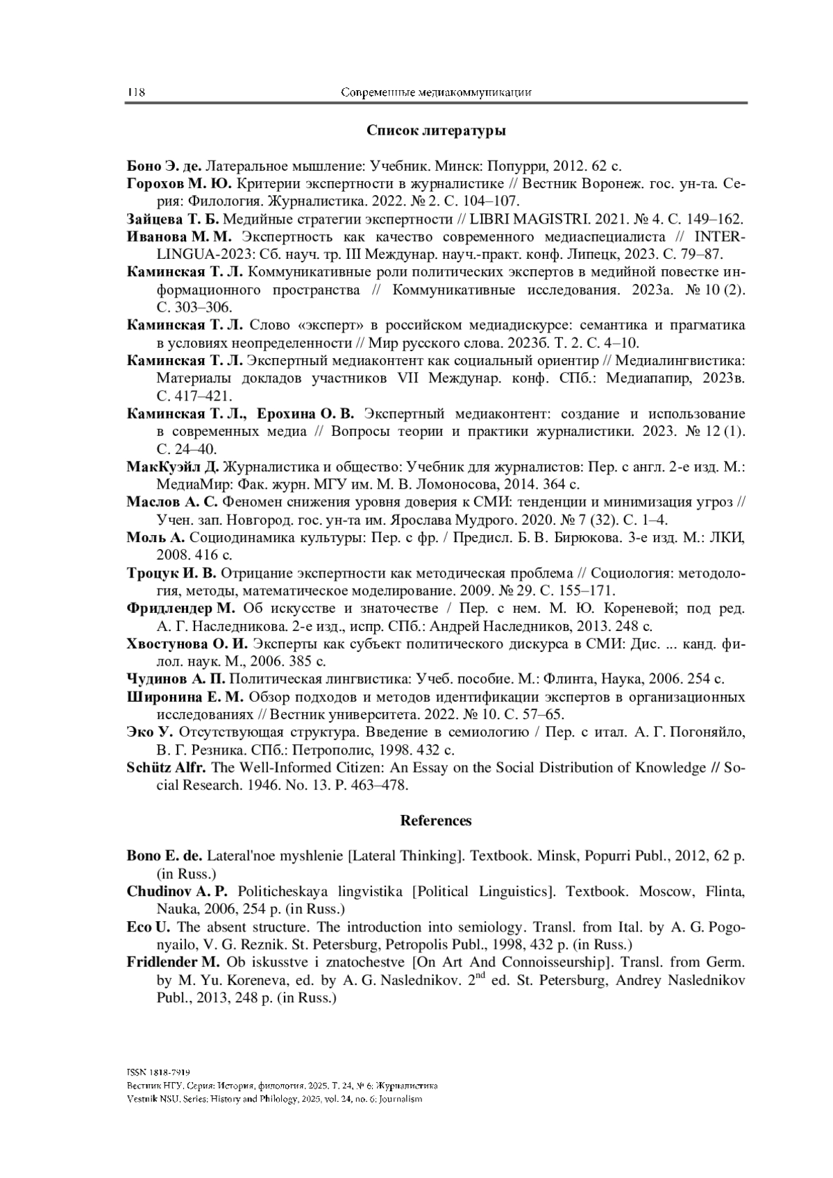 6. Каминская Т. Л. Слово «эксперт» в российском медиадискурсе: семантика и прагматика в условиях неопределенности // Мир русского слова. 2023б. Т. 2. С. 4-10.