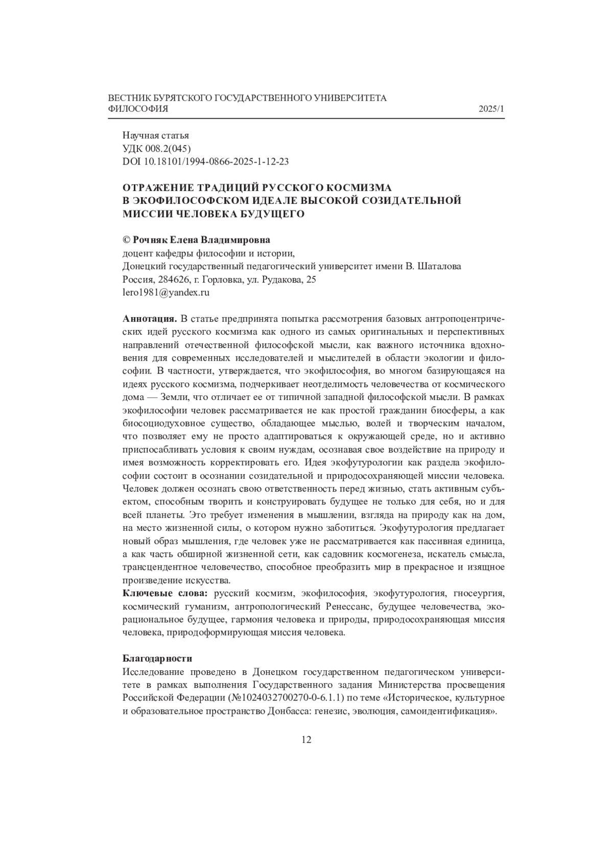 14. Рочняк Е. В. Антропоцентричность экофутурологии как раздела экофилософии // Вестник Бурятского государственного университета. Философия. 2024. № 2. С. 47-52. Текст: непосредственный.