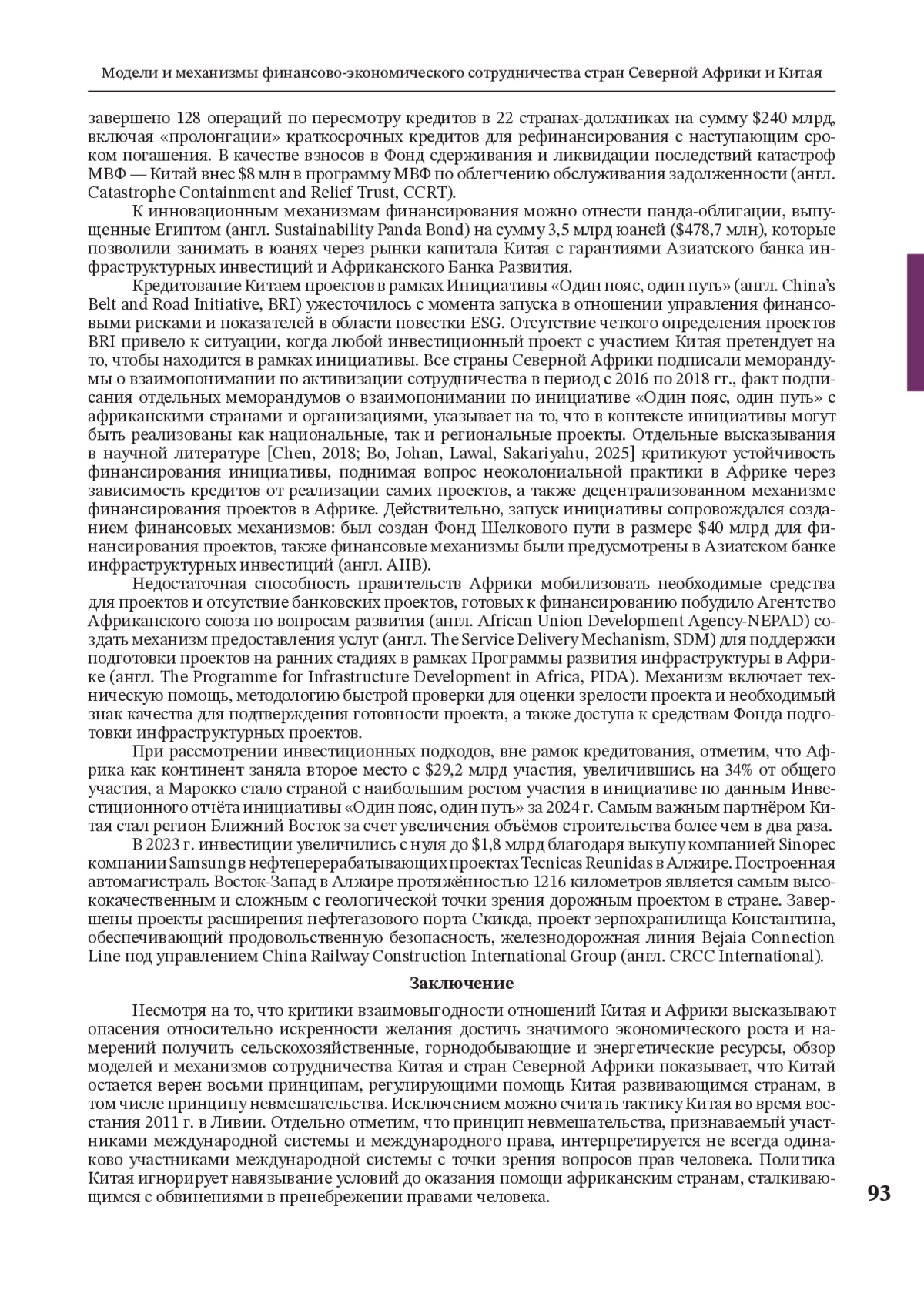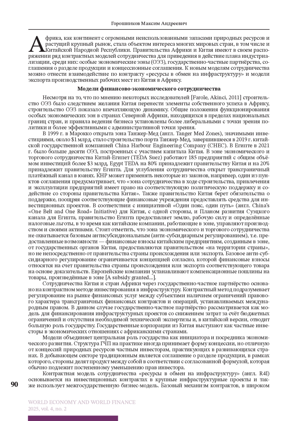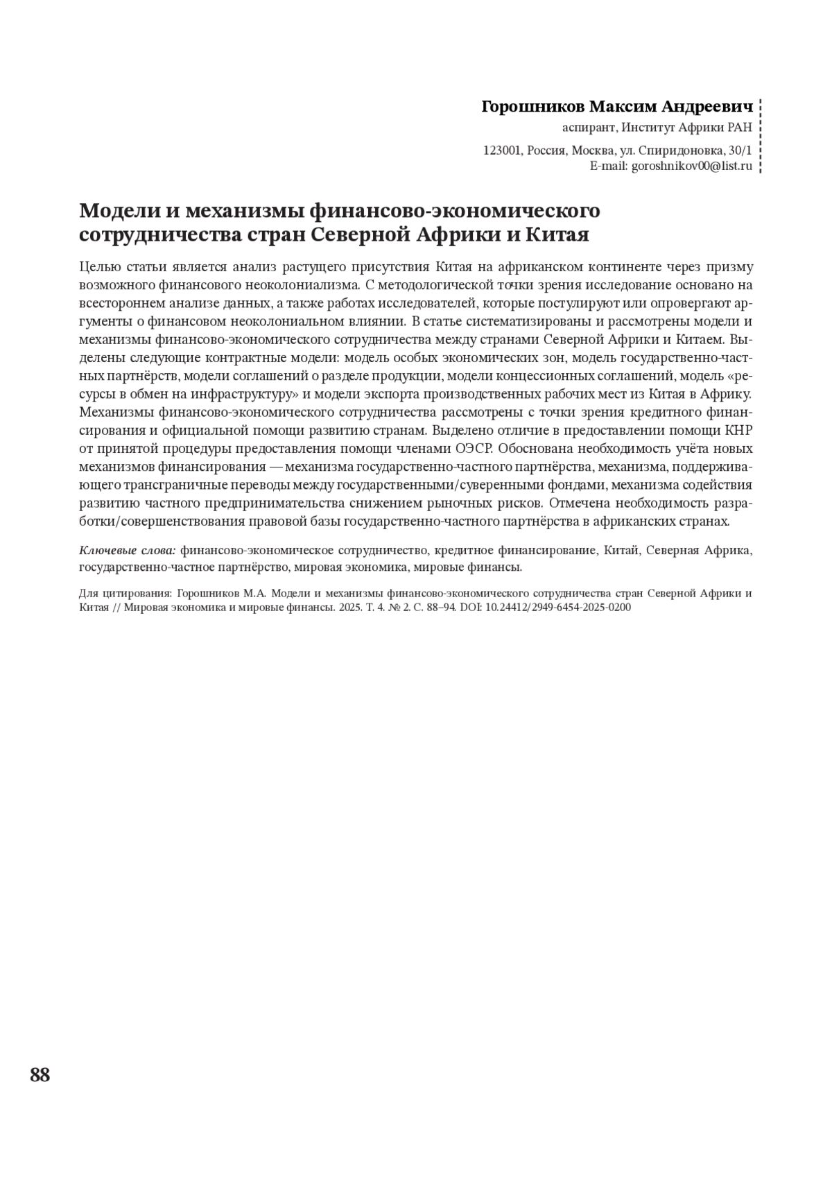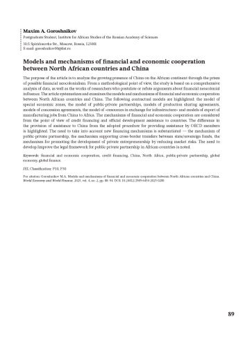 Целью статьи является анализ растущего присутствия Китая на африканском континенте через призму возможного финансового неоколониализма. С методологической точки зрения исследование основано на всестороннем анализе данных, а также работах исследователей, которые постулируют или опровергают аргументы о финансовом неоколониальном влиянии. В статье систематизированы и рассмотрены модели и механизмы финансово-экономического сотрудничества между странами Северной Африки и Китаем. Выделены следующие контрактные модели: модель особых экономических зон, модель государственно-частных партнёрств, модели соглашений о разделе продукции, модели концессионных соглашений, модель «ресурсы в обмен на инфраструктуру» и модели экспорта производственных рабочих мест из Китая в Африку. Механизмы финансово-экономического сотрудничества рассмотрены с точки зрения кредитного финансирования и официальной помощи развитию странам. Выделено отличие в предоставлении помощи КНР от принятой процедуры предоставления помощи членами ОЭСР. Обоснована необходимость учёта новых механизмов финансирования — механизма государственно-частного партнёрства, механизма, поддерживающего трансграничные переводы между государственными/суверенными фондами, механизма содействия развитию частного предпринимательства снижением рыночных рисков. Отмечена необходимость разработки/совершенствования правовой базы государственно-частного партнёрства в африканских странах.