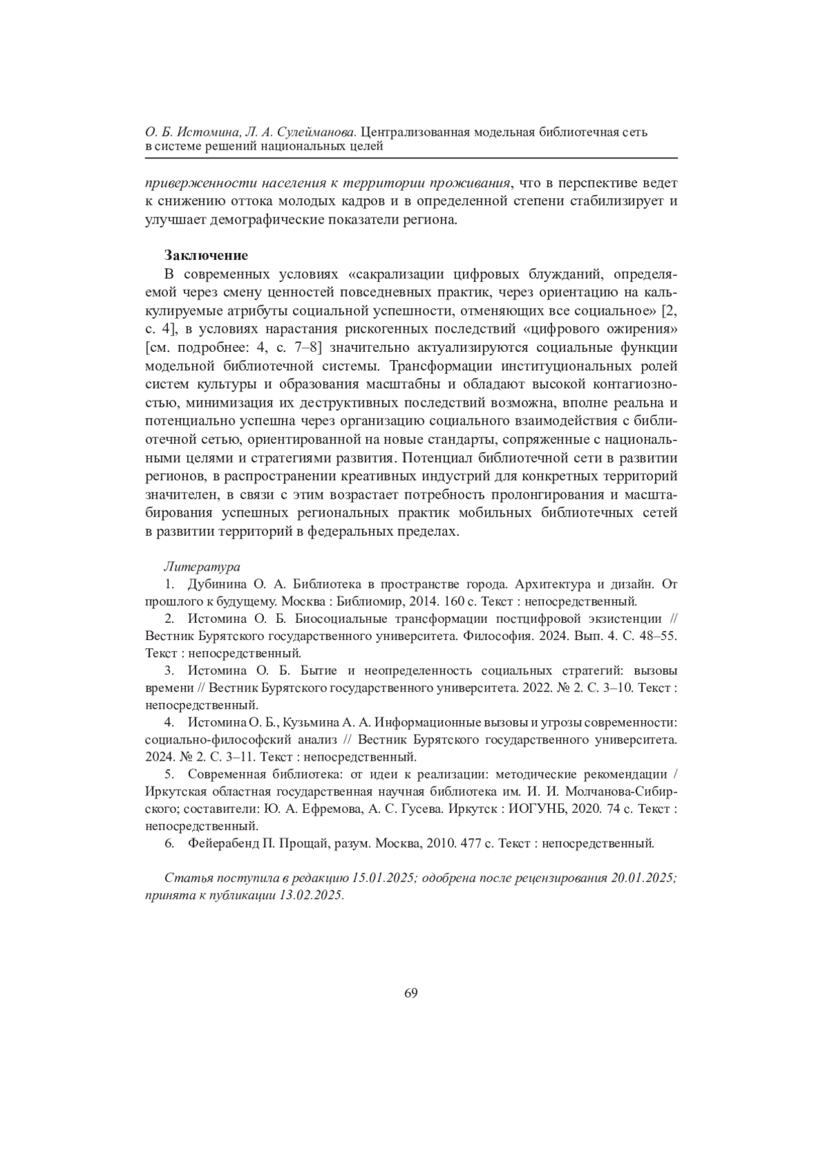 2. Истомина О. Б. Биосоциальные трансформации постцифровой экзистенции // Вестник Бурятского государственного университета. Философия. 2024. Вып. 4. С. 48-55. Текст: непосредственный.