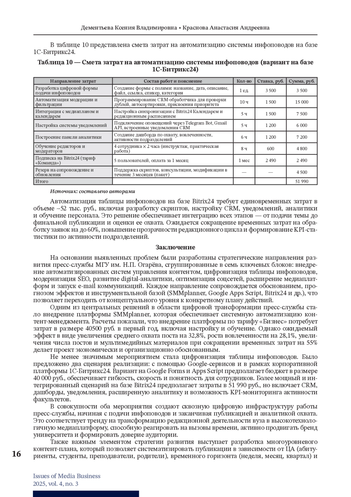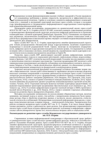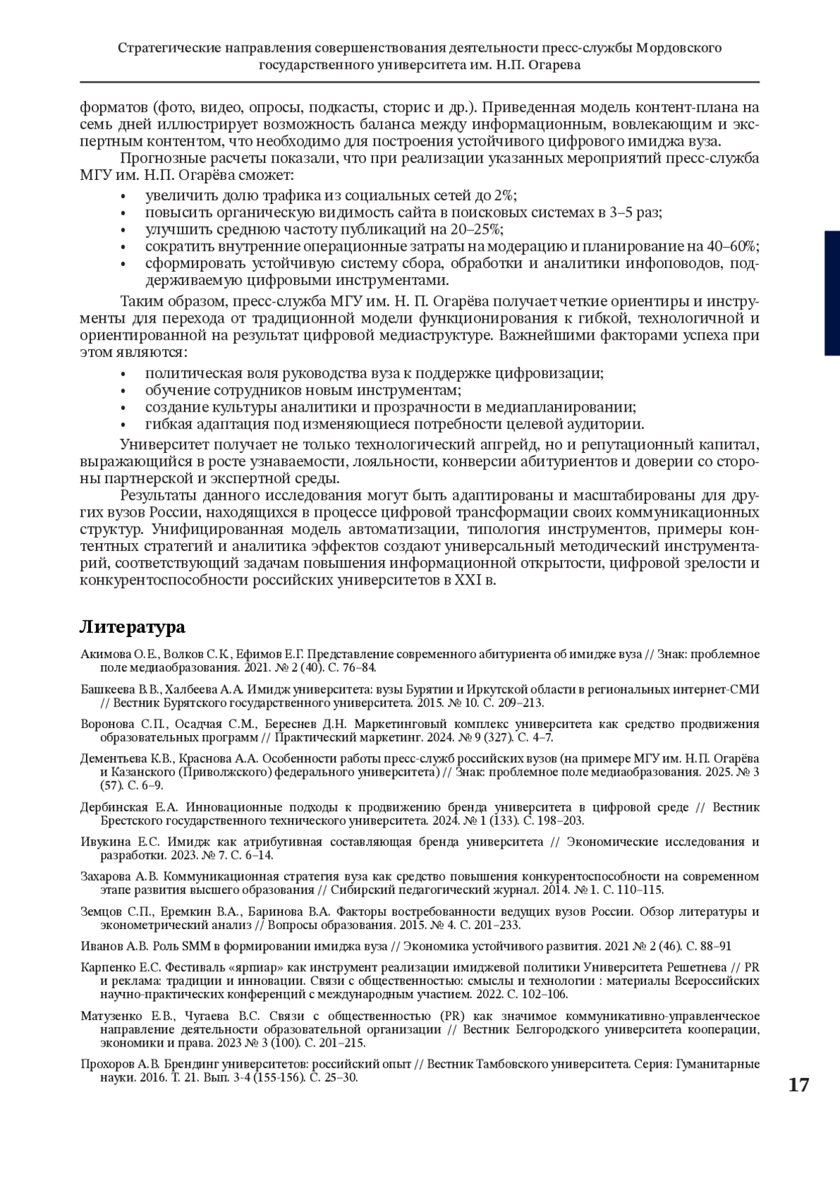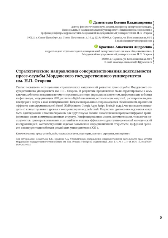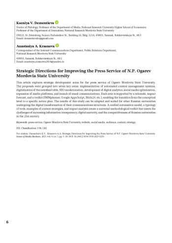 ДЕМЕНТЬЕВА К. В., КРАСНОВА А. А. СТРАТЕГИЧЕСКИЕ НАПРАВЛЕНИЯ СОВЕРШЕНСТВОВАНИЯ ДЕЯТЕЛЬНОСТИ ПРЕСС-СЛУЖБЫ МОРДОВСКОГО ГОСУДАРСТВЕННОГО УНИВЕРСИТЕТА ИМ. Н. П. ОГАРЕВА // ВОПРОСЫ МЕДИАБИЗНЕСА. 2025. № 3, ТОМ 4