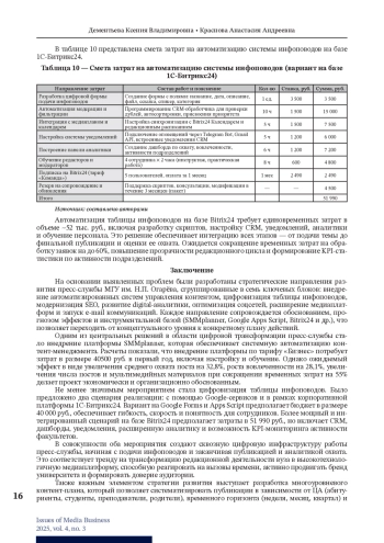 Статья посвящена исследованию стратегических направлений развития пресс-службы Мордовского государственного университета им. Н. П. Огарева. В результате предложения были сгруппированы в семь ключевых блоков: внедрение автоматизированных систем управления контентом, цифровизация таблицы инфоповодов, модернизация SEO, развитие digital-аналитики, оптимизация соцсетей, расширение медиаплатформ и запуск e-mail коммуникаций. Каждое направление сопровождается обоснованием, прогнозом эффектов и инструментальной базой (SMMplanner, Google Apps Script, Bitrix24 и др.), что позволяет переходить от концептуального уровня к конкретному плану действий. Результаты данного исследования могут быть адаптированы и масштабированы для других вузов России, находящихся в процессе цифровой трансформации своих коммуникационных структур. Унифицированная модель автоматизации, типология инструментов, примеры контентных стратегий и аналитика эффектов создают универсальный методический инструментарий, соответствующий задачам повышения информационной открытости, цифровой зрелости и конкурентоспособности российских университетов в XXI в.