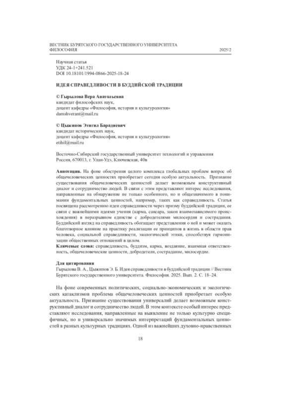 На фоне современных политических, социально-экономических и экологических катаклизмов проблема общечеловеческих ценностей приобретает особую актуальность. Признание существования универсалий делает возможным конст- руктивный диалог и сотрудничество людей. В этом контексте особый интерес представляют исследования, направленные на выявление не только культурно специфичных, но и универсально значимых интерпретаций фундаментальных ценностей в разных культурных традициях. Одной из важнейших духовно-нравственных ценностей является справедливость, рассмотрение которой через призму буддийской философии в сравнении с западными теориями может обогатить представления о ней и оказать благотворное влияние на практику реализации ее принципов в жизнь.