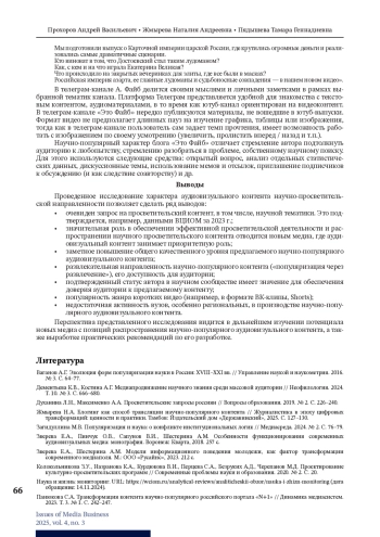10. Панюкова С.А. Трансформация контента научно-популярного российского портала “N+1” // Динамика медиасистем. 2023. Т. 3. № 1. С. 242-247.