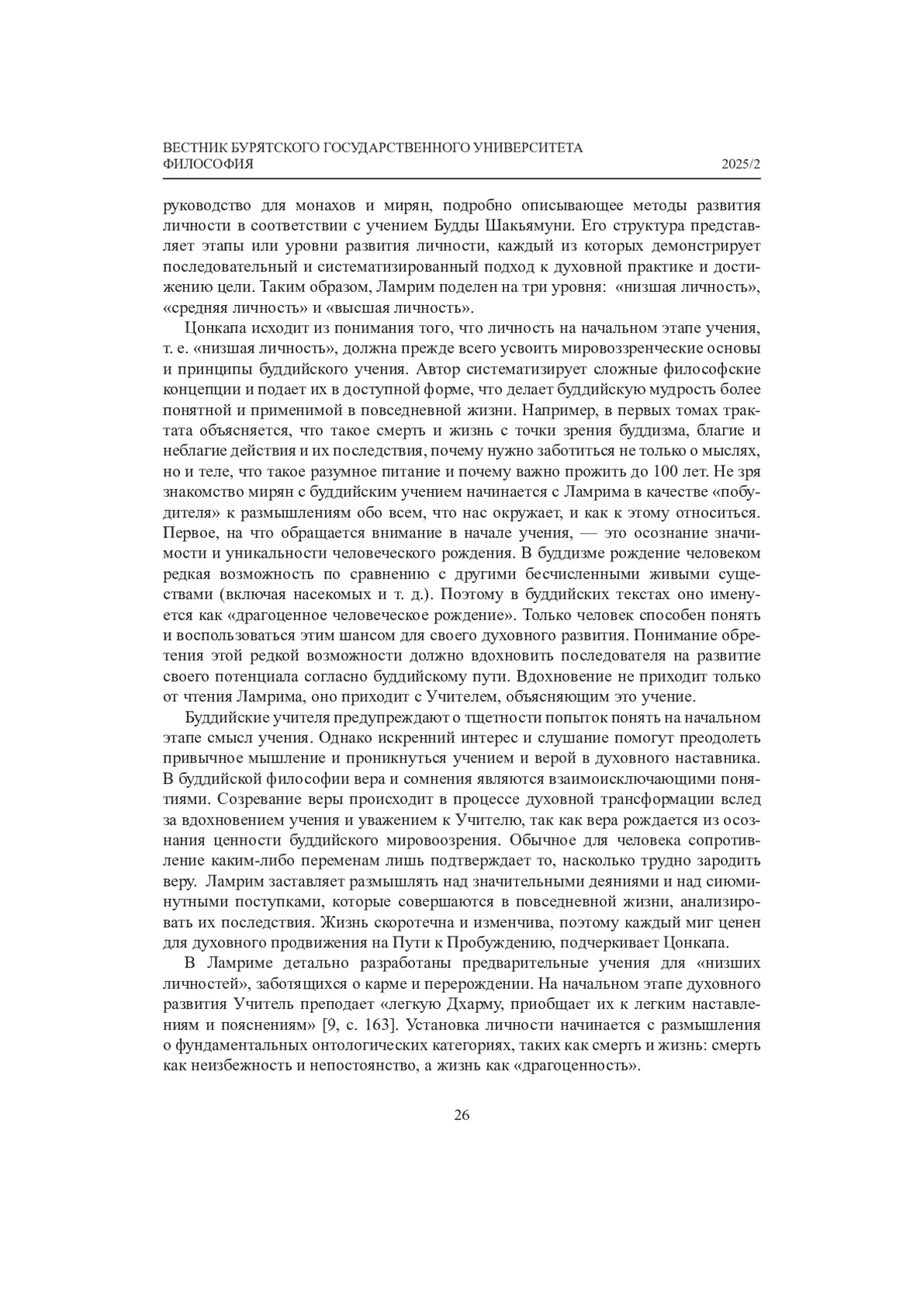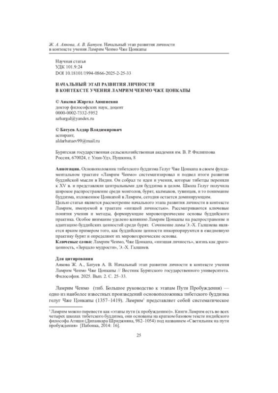 Основоположник тибетского буддизма Гелуг Чже Цонкапа в своем фундаментальном трактате «Ламрим Ченмо» систематизировал и подвел итоги развития буддийской мысли в Индии. Он собрал те идеи и учения, которые тибетцы переняли к XV в. и представляли центральными для буддизма в целом. Школа Гелуг получила широкое распространение среди монголов, бурят, калмыков, тувинцев, и то понимание буддизма, изложенное Цонкапой в Ламрим, сегодня остается доминирующим. Целью статьи является рассмотрение начального этапа развития личности в контексте Ламрим, именуемой в трактате «низшей личностью». Рассматриваются ключевые понятия учения и методы, формирующие мировоззренческие основы буддийского практика. Особое внимание уделено влиянию Ламрим Цонкапы на распространение и адаптацию буддийских ценностей среди бурят. Сочинение ламы Э.-Х. Галшиева является ярким примером того, как буддийские ценности инкорпорируются в ежедневную практику бурят и определяют их мировоззренческие основы.