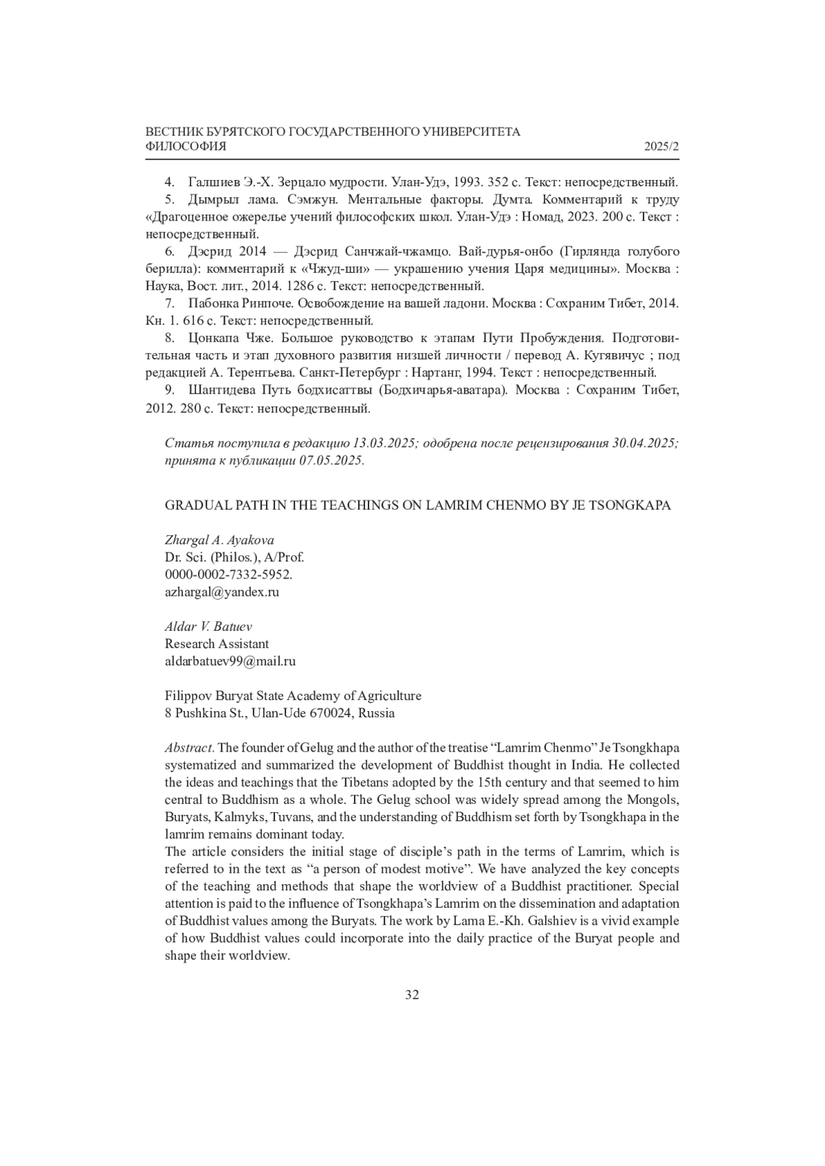 3. Аякова Ж. А., Рабданова Ж.Б. “Зерцало мудрости” ламы Э.- Х. Галшиева: духовное и мирское бытие бурят // Социокультурная динамика в условиях глобализации. Улан-Удэ: Изд-во Бурят. гос. ун-та, 2020. С. 108-115. Текст: непосредственный.