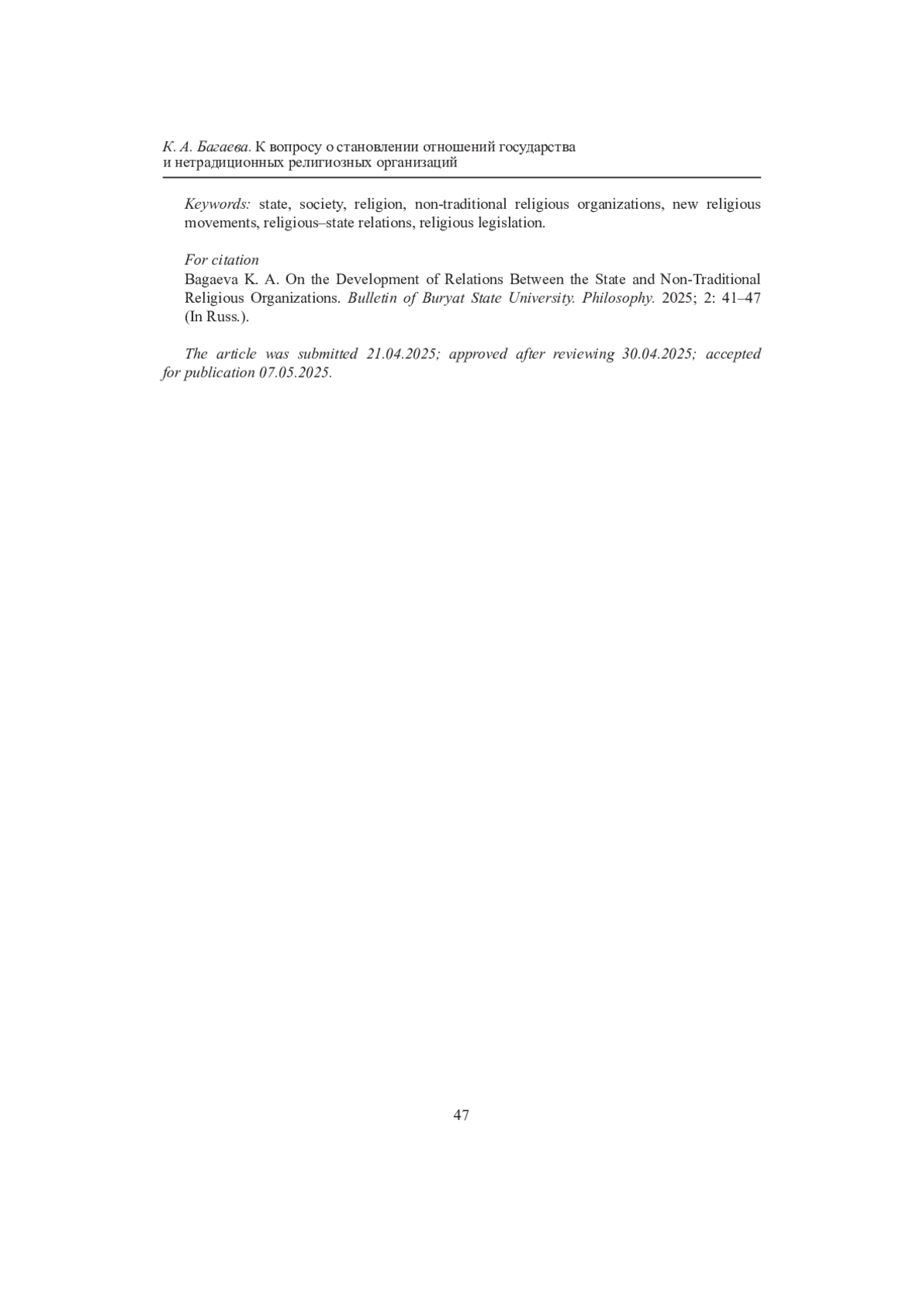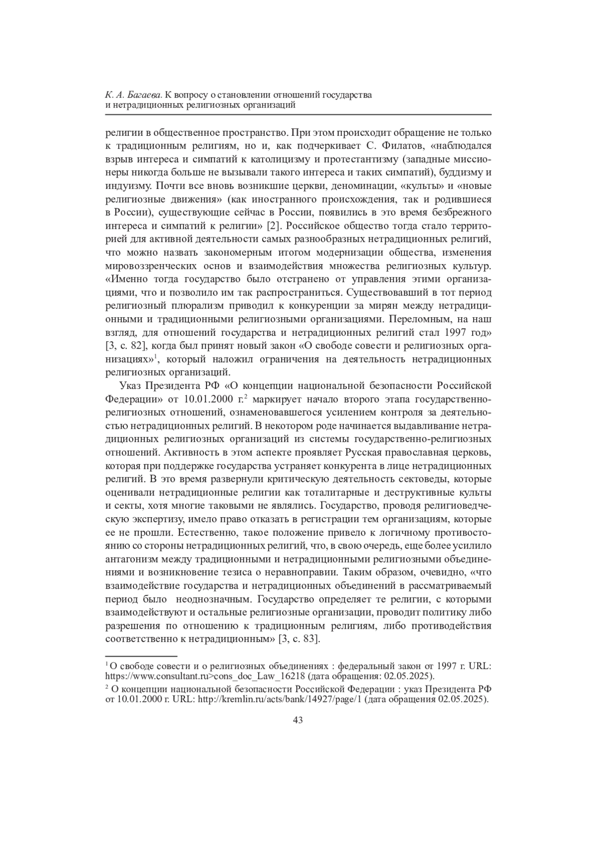 3. Багаева К. А. К вопросу о нетрадиционных религиозных организациях в России // Евразийство и мир. 2019. № 2. С. 80-84. Текст: непосредственный. EDN: JOERGY