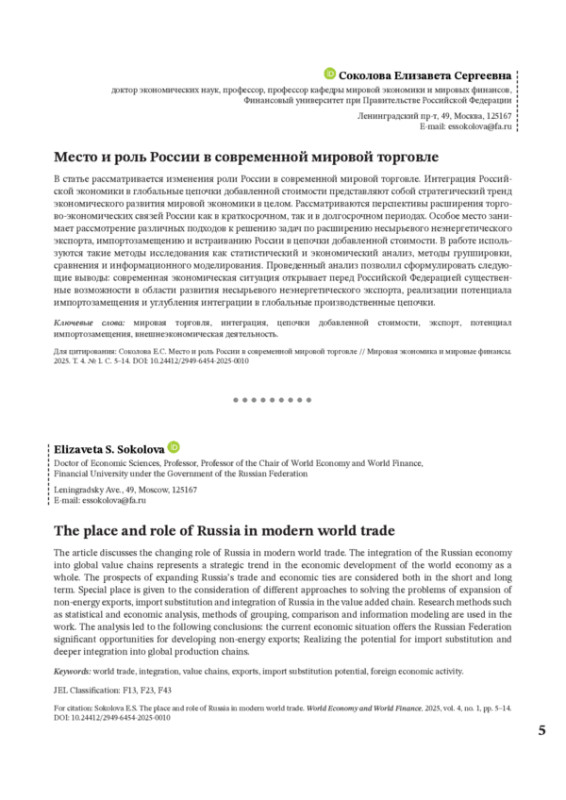 5. Воронова Т.А. Перестройка внешнеэкономической деятельности России в условиях санкций: вызовы и возможности // Вестник Алтайской академии экономики и права. 2023. № 12-3. С. 410-414.
