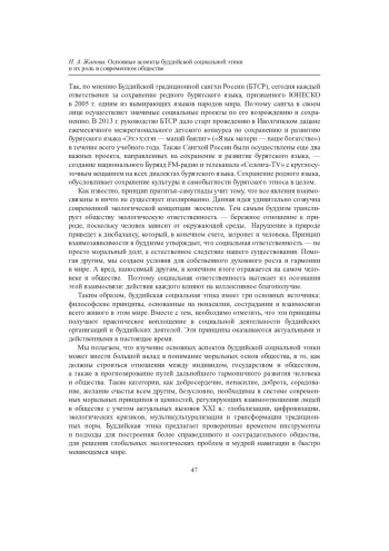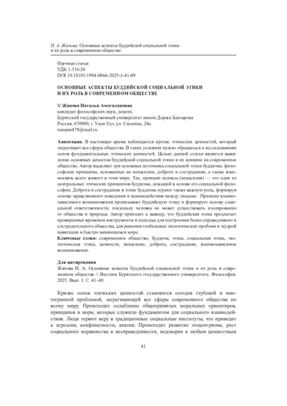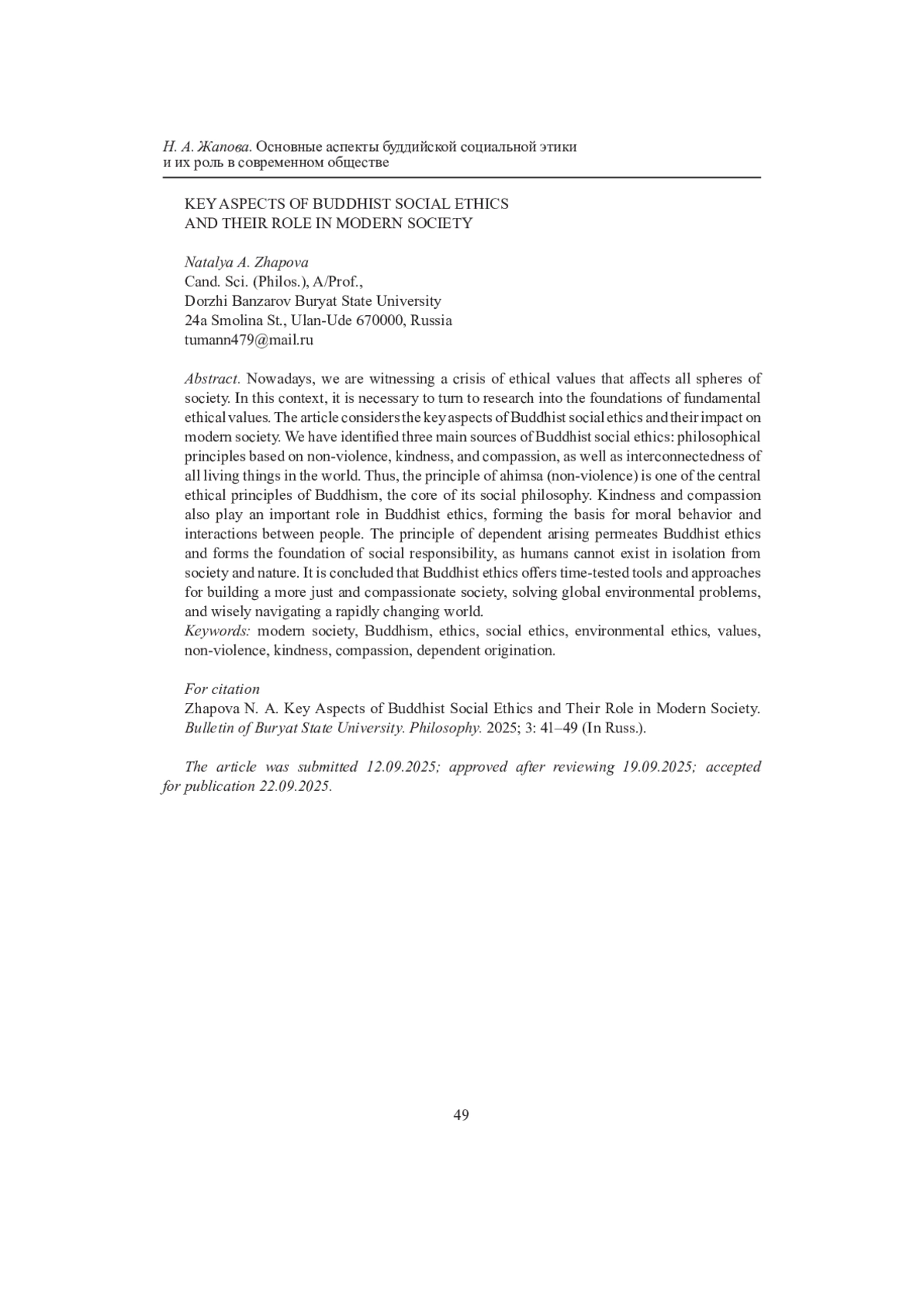 В настоящее время наблюдается кризис этических ценностей, который затрагивает все сферы общества. В таких условиях нужно обращаться к исследованиям основ фундаментальных этических ценностей. Целью данной статьи является выявление основных аспектов буддийской социальной этики и их влияние на современное общество. Автор выделяет три основных источника социальной этики буддизма: философские принципы, основанные на ненасилии, доброте и сострадании, а также взаимосвязь всего живого в этом мире. Так, принцип ахимсы (ненасилия) - это один из центральных этических принципов буддизма, лежащий в основе его социальной философии. Доброта и сострадание в этике буддизма играют также важную роль, формируя основу нравственного поведения и взаимодействия между людьми. Принцип взаимозависимого возникновения пронизывает буддийскую этику и формирует основу социальной ответственности, поскольку человек не может существовать изолированно от общества и природы. Автор приходит к выводу, что буддийская этика предлагает проверенные временем инструменты и подходы для построения более справедливого и сострадательного общества, для решения глобальных экологических проблем и мудрой навигации в быстро меняющемся мире.