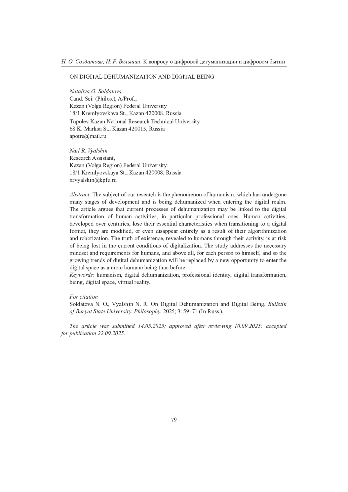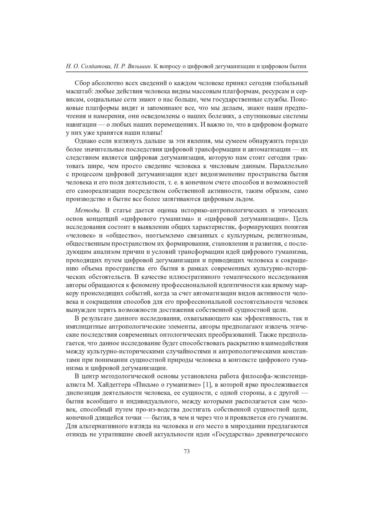 Предметом данной научной работы является феномен гуманизма, прошедший многие стадии развития своего содержания и оборачивающийся в наши дни дегуманизацией при попадании на цифровое поле. В статье утверждается, что текущие процессы дегуманизации могут быть связаны с цифровой трансформацией деятельности человека, в частности профессиональной. Веками складывающиеся виды активной деятельности человека при переходе в цифровой формат утрачивают сущностные характеристики, видоизменяются или вовсе пропадают в процессе их алгоритмизации и роботизации. Истина бытия, открываемая человеку посредством его деятельности, оказывается под угрозой нераскрытия в современных условиях цифровизации. В исследовании ставится вопрос о необходимых установках и требованиях к человеку и прежде всего каждого к самому себе, чтобы возрастающие тенденции цифровой дегуманизации были заменены новой возможностью ступания на цифровое пространство в качестве более гуманного существа, чем прежде.
