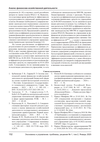 1. Бубновская Т. В., Гавриш П. Т. Система комплексной оценки финансово- хозяйственной деятельности организаций бюджетной сферы на основе годовой бухгалтерской отчетности // Вестник Астраханского государственного технического университета. Серия: Экономика. - 2023. - № 3. - С. 108-118. -. DOI: 10.24143/2073-5537-2023-108-118 EDN: QBDPTQ