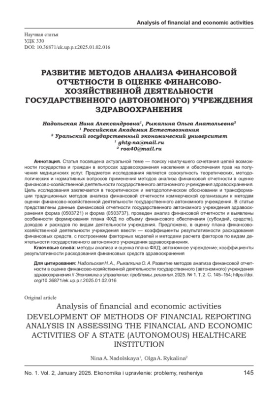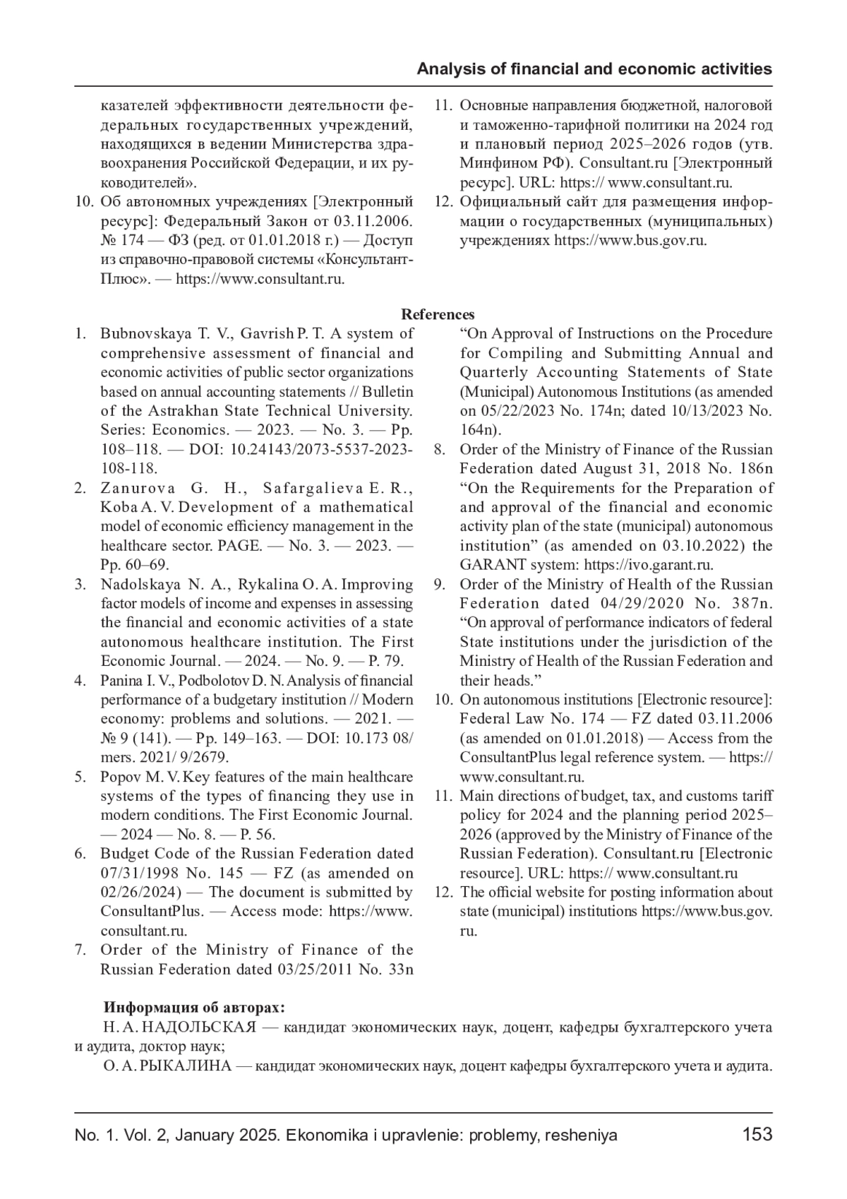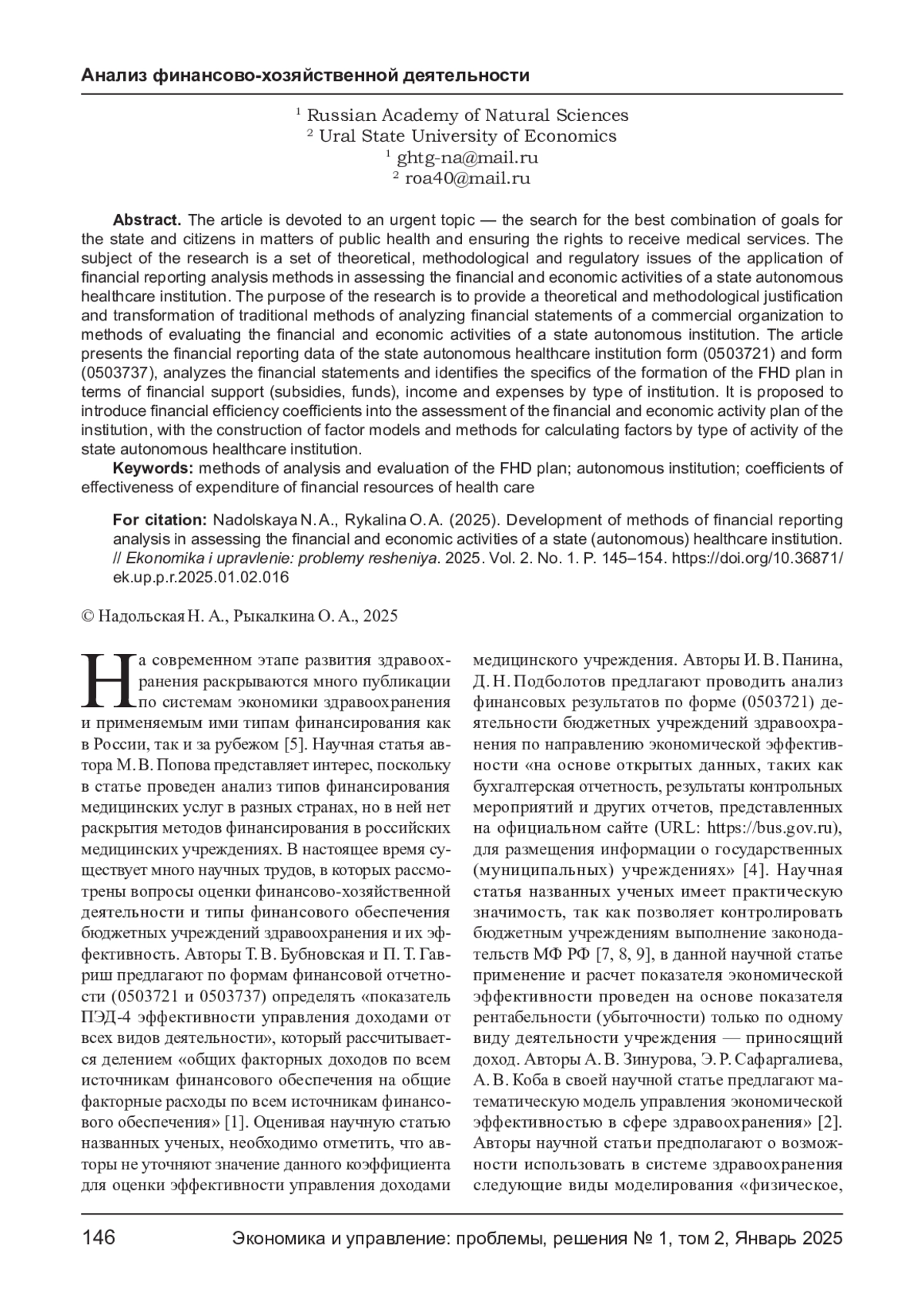 3. Надольская Н. А., Рыкалина О. А. Совершенствование факторных моделей доходов и расходов в оценке финансово-хозяйственной деятельности государственного автономного учреждения здравоохранения. Первый экономический журнал. - 2024. - № 9. - С. 79. EDN: CUBWLO