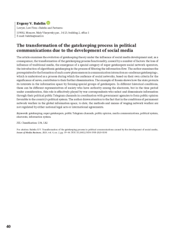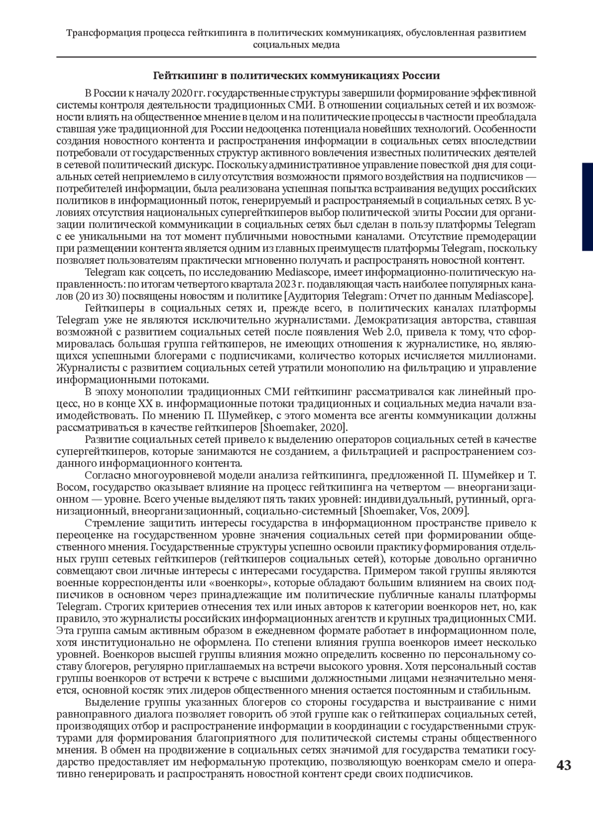 В статье исследуется эволюция теории гейткипинга под влиянием развития социальных медиа и как, следствие этого, трансформация функционала процесса гейткипинга, обусловленная рядом факторов: утратой влияния традиционных СМИ, появлением особой категории супергейткиперов-операторов социальных сетей, внедрением алгоритмического гейткипинга в процесс фильтрации информационного потока. Автор рассматривает предпосылки формирования такого нового явления в коммуникационном взаимодействии, как «гейткипинг аудитории», который понимается как процесс, в ходе которого аудитория социальных сетей на основе собственных критериев значимости новостей способствует их дальнейшему распространению. На примере России показано, как государство защищает свои интересы в информационном пространстве путем формирования особых групп гейткиперов. В разных исторических условиях это могут быть разные представители общества, обладающие авторитетом среди электората, но в рассматриваемом временном периоде эту роль эффективно играют военные корреспонденты, которые проводят отбор и распространение информации через свои политические публичные Telegram-каналы в координации с государственными структурами для формирования благоприятного для политической системы страны общественного мнения. Автор обращает внимание на то, что в условиях перманентной сетевой войны в глобальном информационном пространстве до настоящего времени методы и средства ведения сетевой войны не регламентированы ни национальными правовыми актами, ни международными соглашениями.