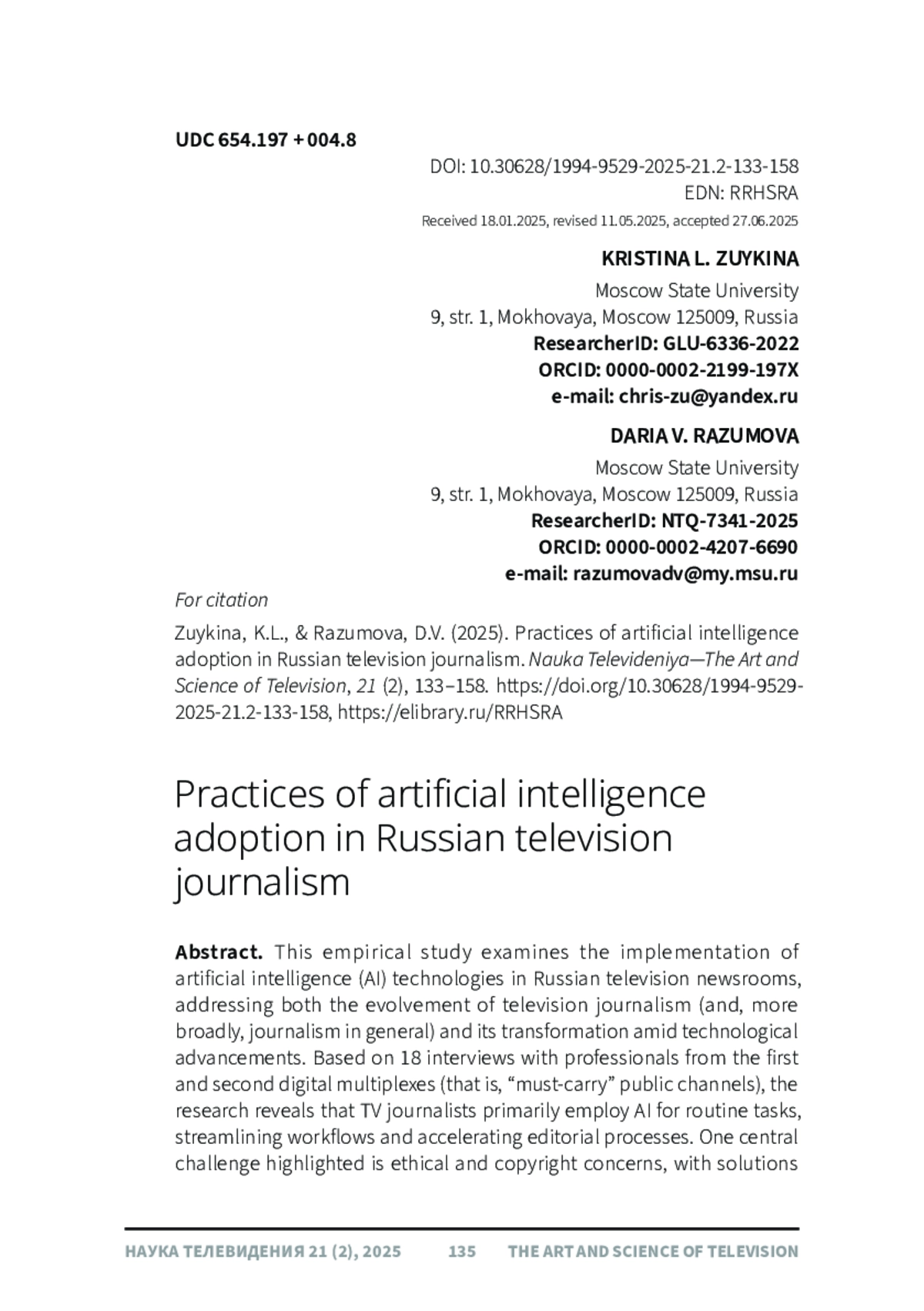 В статье изложены результаты эмпирических исследований практики использования технологий искусственного интеллекта (далее - ИИ) в российских телевизионных редакциях в двадцатых дискуссиях будущей телевизионной (шире - журналистской) профессии и ее трансформации в условиях развития новых технологий. Для работы было проведено 18 интервью с направлениями, входящими в состав первого и частично второго мультиплексов, т. е. е. обязательных общедоступных телеканалов телевидения. Результаты исследования показывают, что сотрудники телевизионных редакций в силе профессиональных специалистов решают с помощью ИИ ряд достаточно тривиальных задач, что позволяет оптимизировать работу редакции и ускорить процесс редактирования. Одной из важных проблем применения технологии ИИ являются вопросы этики и авторского права, которые решаются в каждой редакции по-своему. Многие информанты основаны на создании внутриредакционных стандартов работы с технологиями ИИ и закреплении правил работы с новыми технологиями на законодательном уровне. По мере вероятной трансформации телевизионных участников исследования отдельных направлений оптимизации и ускорения некоторых «механических» процессов, благодаря чему журналисты концентрируются на создании более качественного и эксклюзивного контента. Среди возможных негативных последствий развития технологий ИИ в работе редактирования: увеличение скорости рабочих процессов, что может сказаться на повышении уровня стресса журналистов; увеличение количества фейковых новостей, сгенерированных ИИ; здоровая творческая профессия.
