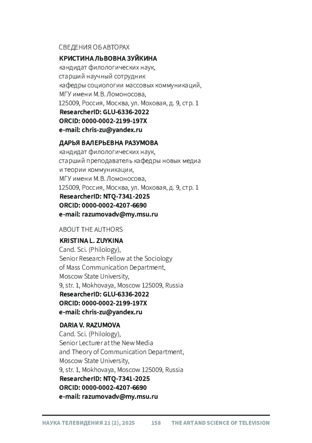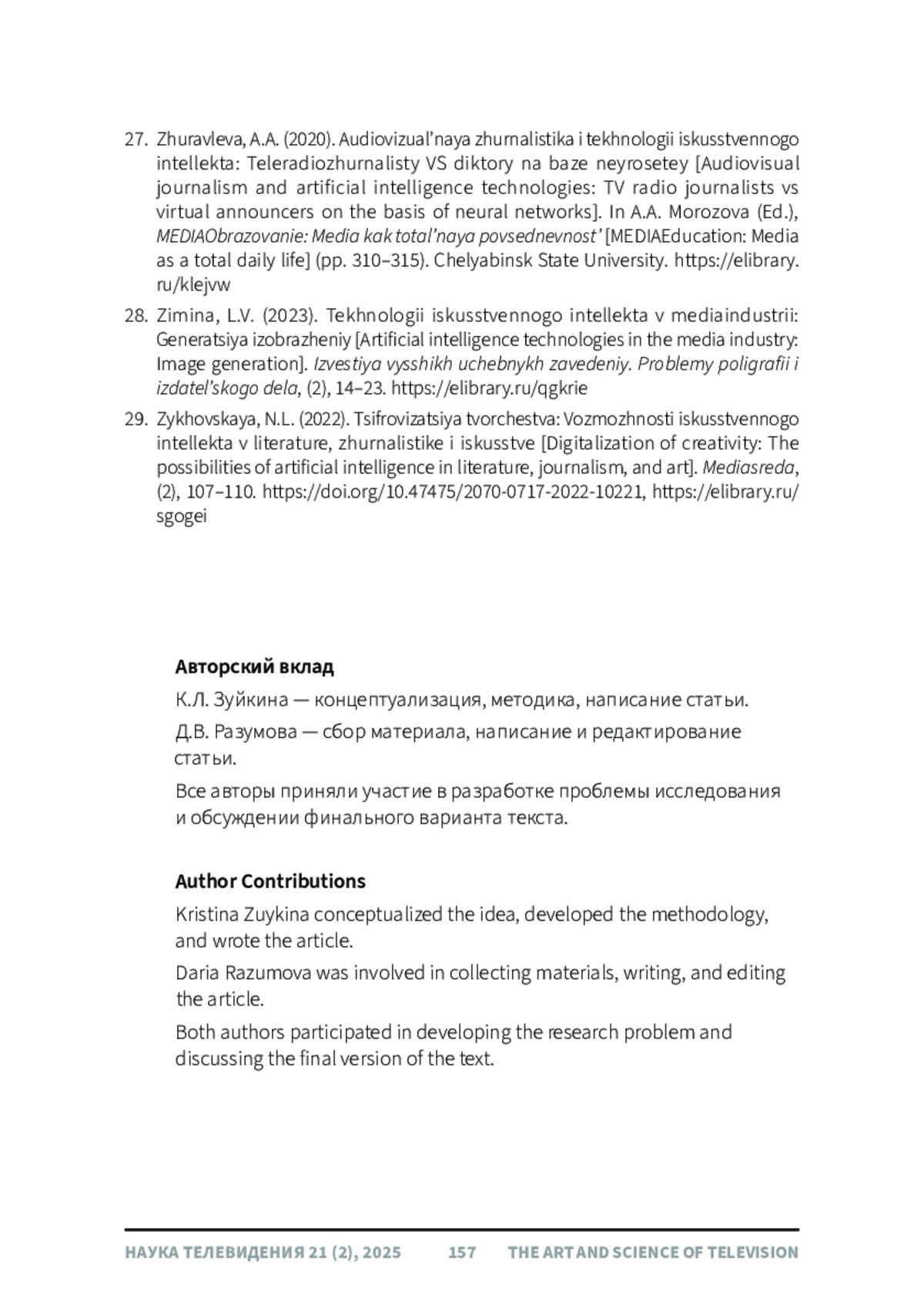 5. Журавлева, А.А. (2020). Аудиовизуальная журналистика и технологии искусственного интеллекта: телерадиожурналисты VS дикторы на базе нейросетей. В А.А. Морозова (Ред.). МЕДИАОбразование: медиа как тотальная повседневность (стр. 310-315). Челябинск: Челябинский государственный университет. EDN: KLEJVW