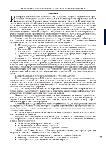 Интеграция искусственного интеллекта (ИИ) в процессы создания медиаконтента представляет собой одну из наиболее актуальных и сложных проблем современной науки и медиаиндустрии. В условиях стремительного развития технологий ИИ становится ключевым инструментом трансформации медиаландшафта. технологии искусственного интеллекта кардинально меняют традиционные подходы к созданию, распространению и потреблению контента, что приводит к пересмотру роли человека в медиапроцессах [Соловьёв, 2021. С. 60–62]. Кроме того, социальные, культурные и психологические аспекты взаимодействия человека с ИИ становятся предметом активных дискуссий. Искусственный интеллект не только трансформирует профессиональные практики, но и становится неотъемлемой частью повседневной жизни, вызывая одновременно восхищение и опасения [Шомова, Качкаева, 2024. С. 12].