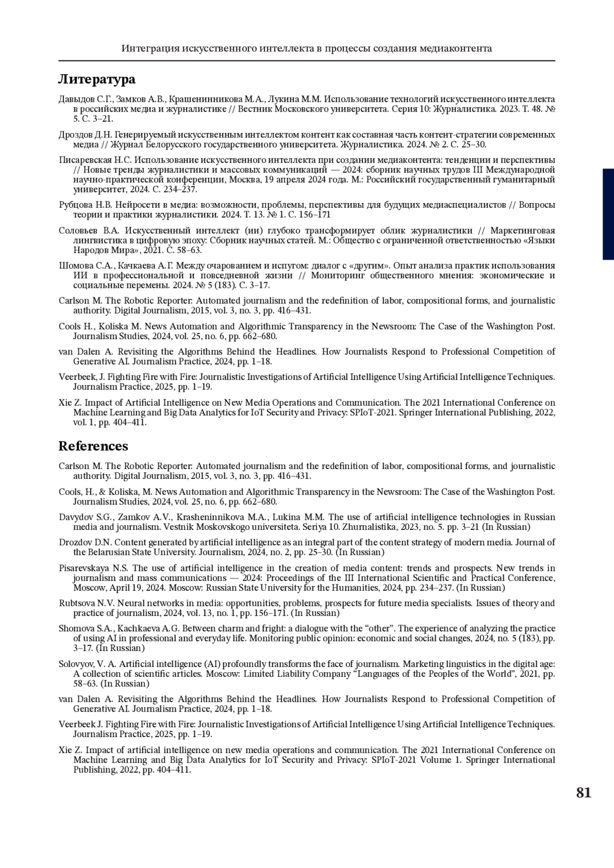 1. Давыдов С.Г., Замков А.В., Крашенинникова М.А., Лукина М.М. Использование технологий искусственного интеллекта в российских медиа и журналистике // Вестник Московского университета. Серия 10: Журналистика. 2023. Т. 48. № 5. С. 3-21. EDN: ZZJRRX