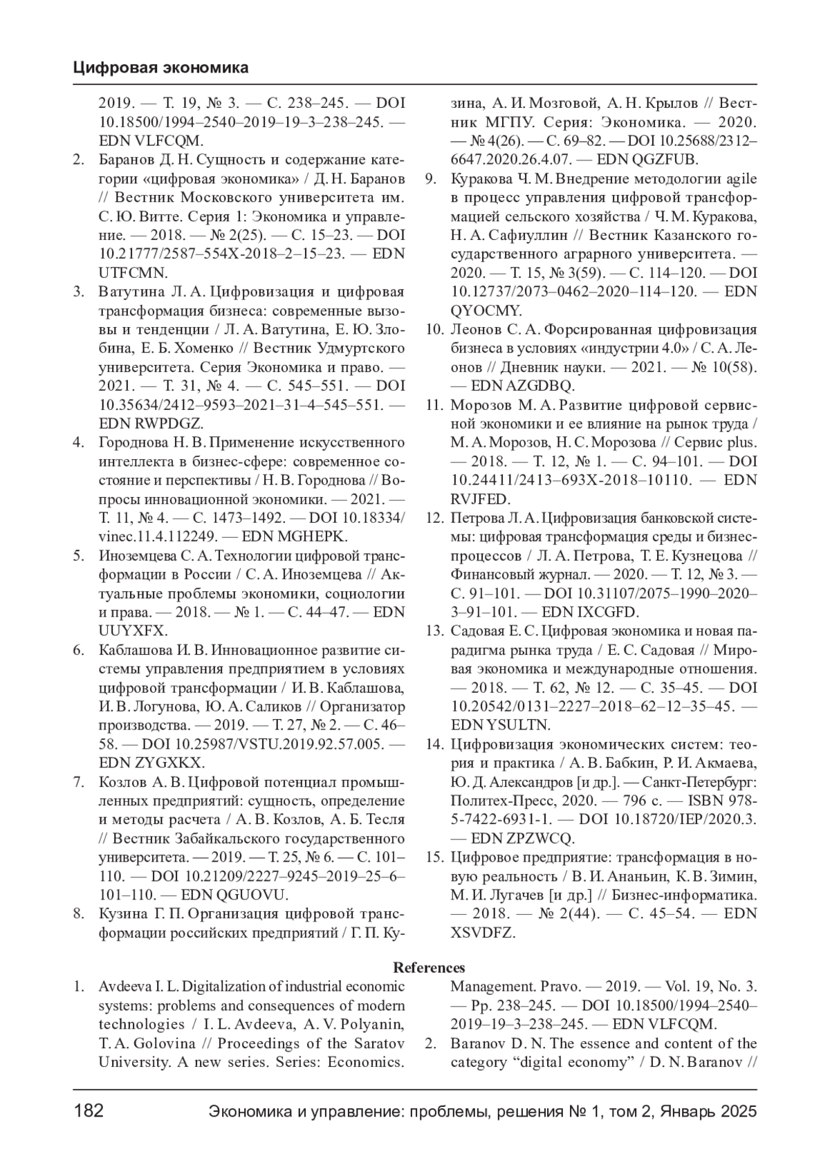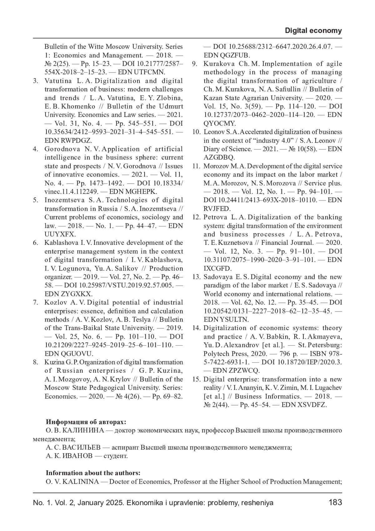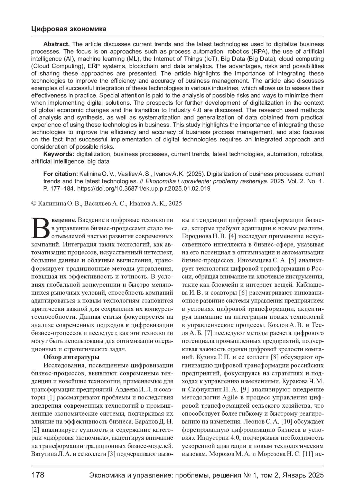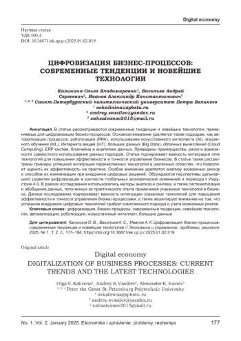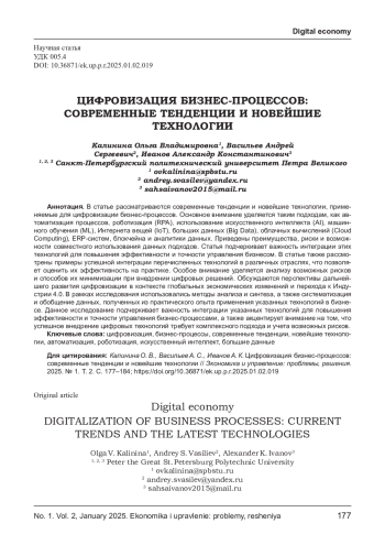 КАЛИНИНА О. В., ВАСИЛЬЕВ А. С., ИВАНОВ А. К. ЦИФРОВИЗАЦИЯ БИЗНЕС-ПРОЦЕССОВ: СОВРЕМЕННЫЕ ТЕНДЕНЦИИ И НОВЕЙШИЕ ТЕХНОЛОГИИ // ЭКОНОМИКА И УПРАВЛЕНИЕ: ПРОБЛЕМЫ, РЕШЕНИЯ. 2025. ТОМ 2 № 1