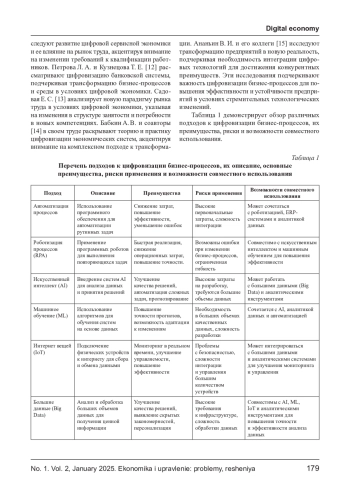В статье рассматриваются современные тенденции и новейшие технологии, применяемые для цифровизации бизнес- процессов. Основное внимание уделяется таким подходам, как автоматизация процессов, роботизация (RPA), использование искусственного интеллекта (AI), машинного обучения (ML), Интернета вещей (IoT), больших данных (Big Data), облачных вычислений (Cloud Computing), ERP-систем, блокчейна и аналитики данных. Приведены преимущества, риски и возможности совместного использования данных подходов. Статья подчеркивает важность интеграции этих технологий для повышения эффективности и точности управления бизнесом. В статье также рассмотрены примеры успешной интеграции перечисленных технологий в различных отраслях, что позволяет оценить их эффективность на практике. Особое внимание уделяется анализу возможных рисков и способов их минимизации при внедрении цифровых решений. Обсуждаются перспективы дальнейшего развития цифровизации в контексте глобальных экономических изменений и перехода к Индустрии 4.0. В рамках исследования использовались методы анализа и синтеза, а также систематизация и обобщение данных, полученных из практического опыта применения указанных технологий в бизнесе. Данное исследование подчеркивает важность интеграции указанных технологий для повышения эффективности и точности управления бизнес- процессами, а также акцентирует внимание на том, что успешное внедрение цифровых технологий требует комплексного подхода и учета возможных рисков.