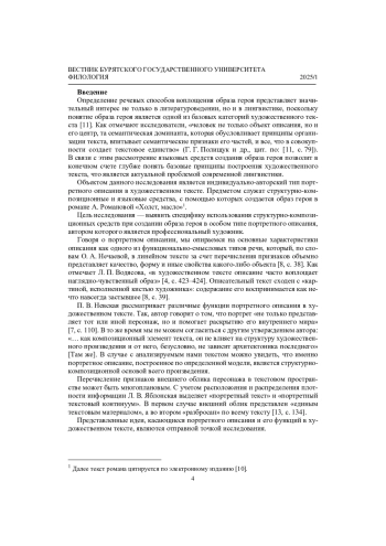 Статья выполнена в русле идей лингвистики текста и посвящена определению роли структурно-композиционных характеристик портретного описания в формировании образа героя в романе, написанном художником. В качестве материала для анализа выбран текст романа А. Романовой «Холст, масло». В статье в качестве примера приводится анализ портретного описания одной героини романа - Анны Вадим (глава 4). Новизна подхода определяется обращением к искусствоведческой литературе и описанием прототипической модели живописного портрета, которая служит основой для структурно-композиционного анализа портретного описания. Целью работы было выявление специфики использования структурно-композиционных средств при создании образа героя в особом типе портретного описания. Были получены следующие результаты. Показано, что автор-художник при создании портретного описания ориентируется на прототипическую модель живописного портрета, создающую «портретный текстовый континуум» каждой главы и служащую основой для структурно-композиционного решения романа. В такого рода текстах портретное описание становится текстообразующим функционально-смысловым типом речи и служит средством формирования образа героя.