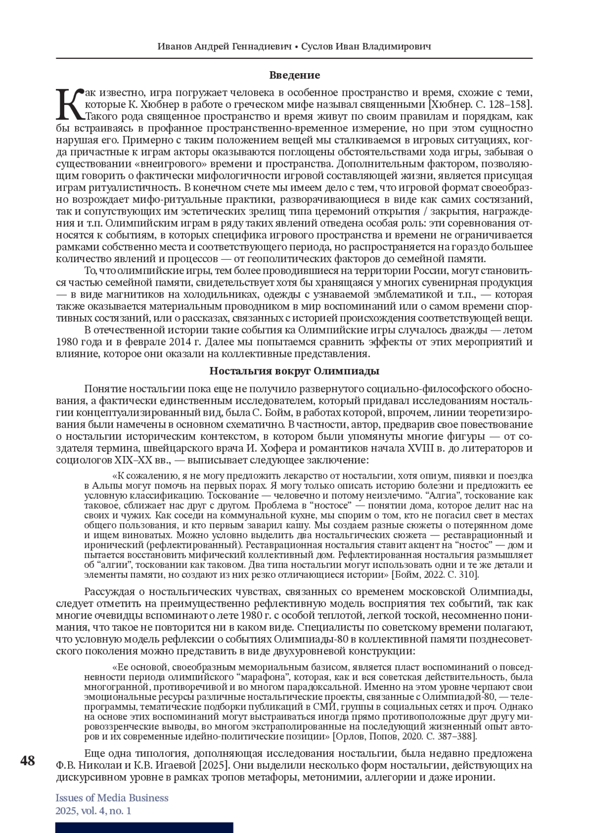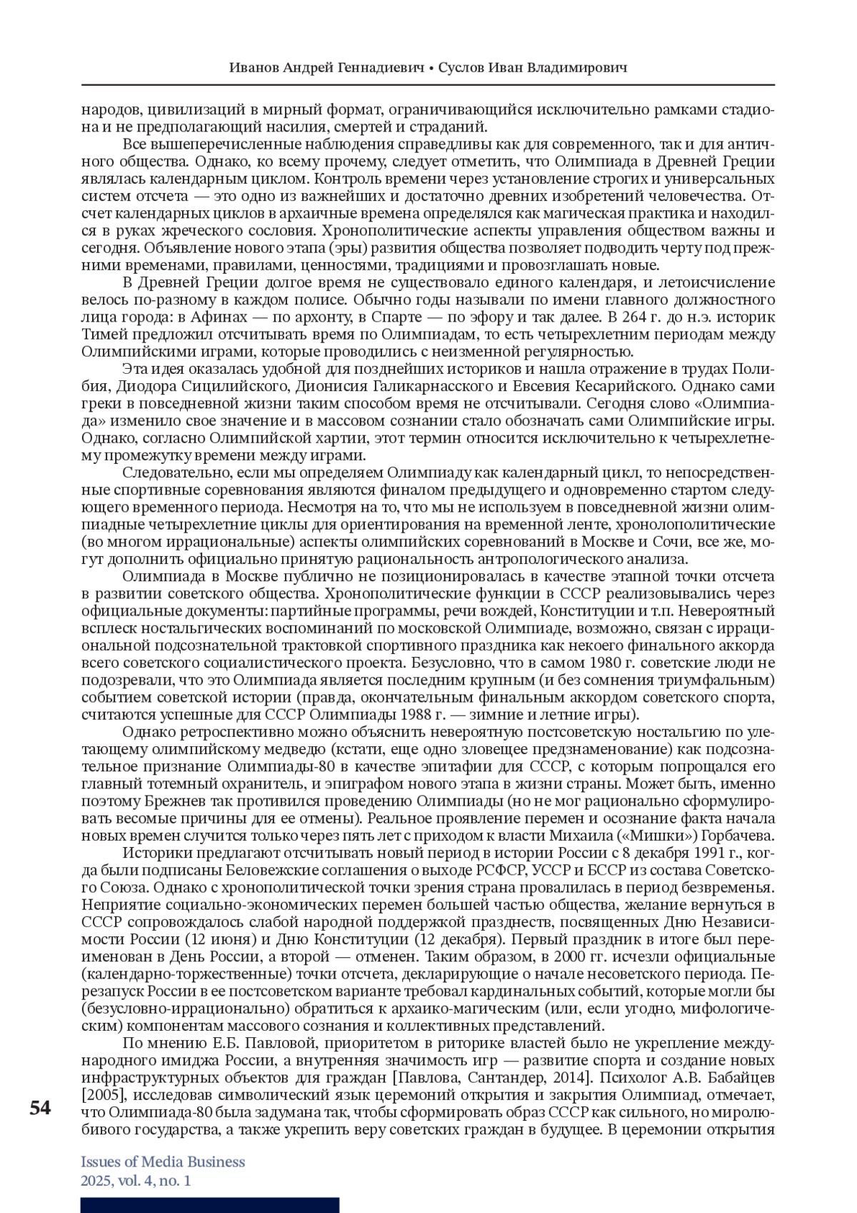 ИВАНОВ А. Г., СУСЛОВ И. В. ИГРЫ, В КОТОРЫЕ ИГРАЮТ ЛЮДИ: ОБЩЕЕ И ОСОБЕННОЕ ПРИ ПРОВЕДЕНИИ XXII ОЛИМПИАДЫ (МОСКВА-1980 VS СОЧИ-2014) // ВОПРОСЫ МЕДИАБИЗНЕСА. 2025. № 1, ТОМ 4
