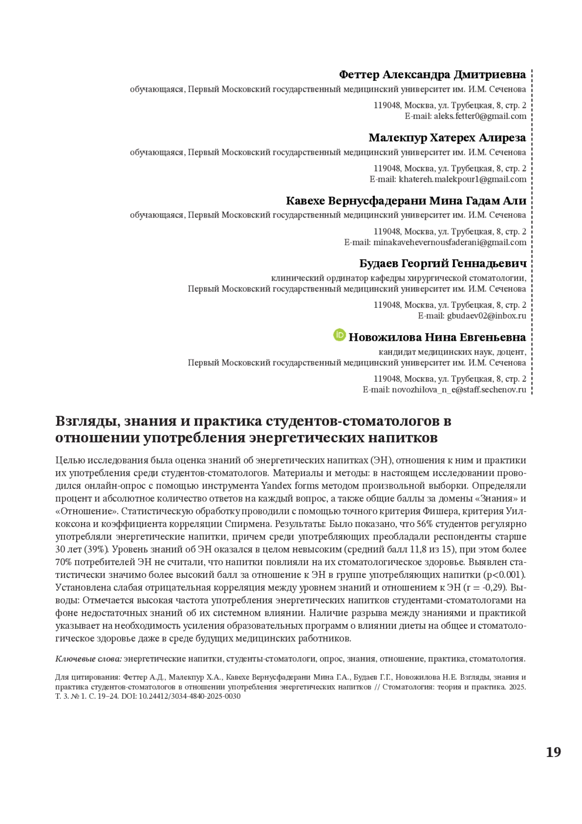 Целью исследования была оценка знаний об энергетических напитках (ЭН), отношения к ним и практики их употребления среди студентов-стоматологов. Материалы и методы: в настоящем исследовании проводился онлайн-опрос с помощью инструмента Yandex forms методом произвольной выборки. Определяли процент и абсолютное количество ответов на каждый вопрос, а также общие баллы за домены «Знания» и «Отношение». Статистическую обработку проводили с помощью точного критерия Фишера, критерия Уилкоксона и коэффициента корреляции Спирмена. Результаты: Было показано, что 56% студентов регулярно употребляли энергетические напитки, причем среди употребляющих преобладали респонденты старше 30 лет (39%). Уровень знаний об ЭН оказался в целом невысоким (средний балл 11,8 из 15), при этом более 70% потребителей ЭН не считали, что напитки повлияли на их стоматологическое здоровье. Выявлен статистически значимо более высокий балл за отношение к ЭН в группе употребляющих напитки (p<0.001). Установлена слабая отрицательная корреляция между уровнем знаний и отношением к ЭН (r = -0,29). Выводы: Отмечается высокая частота употребления энергетических напитков студентами-стоматологами на фоне недостаточных знаний об их системном влиянии. Наличие разрыва между знаниями и практикой указывает на необходимость усиления образовательных программ о влиянии диеты на общее и стоматологическое здоровье даже в среде будущих медицинских работников.