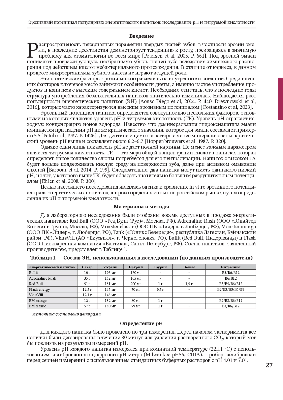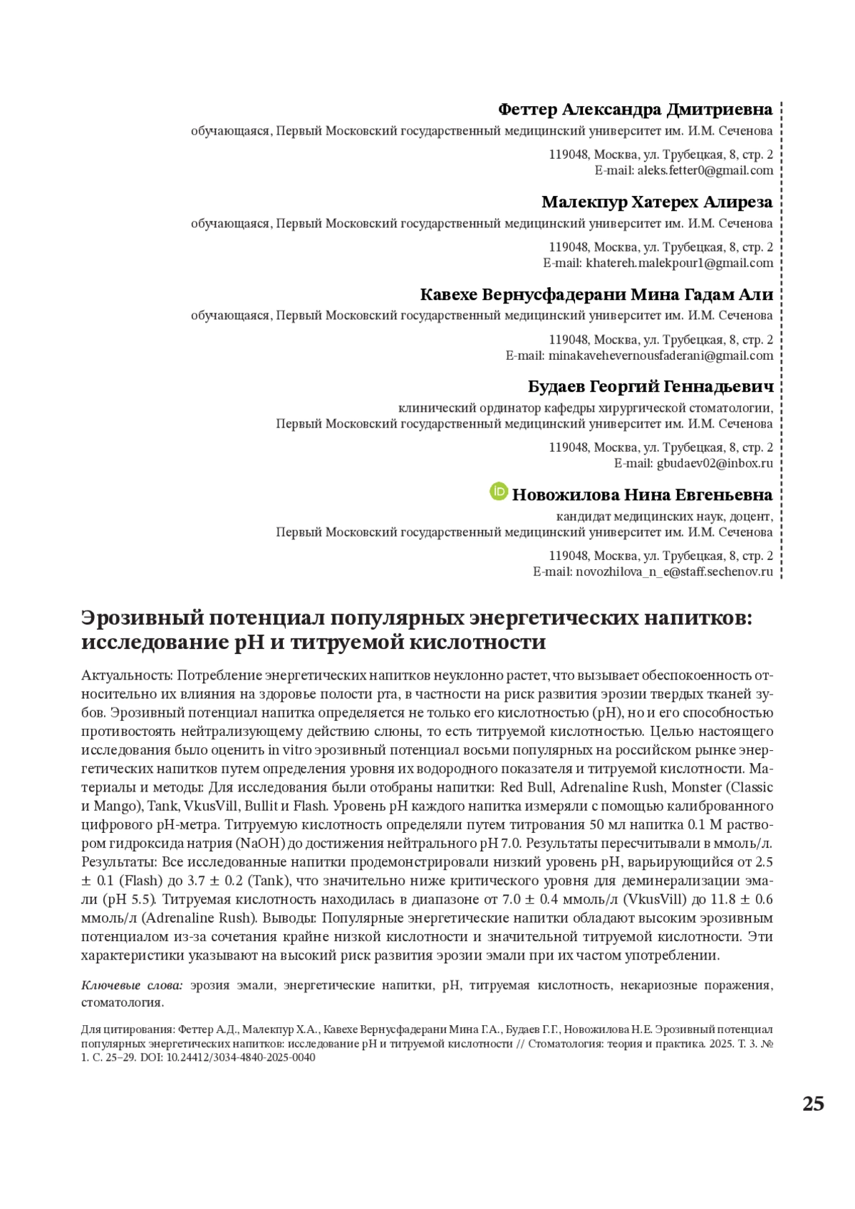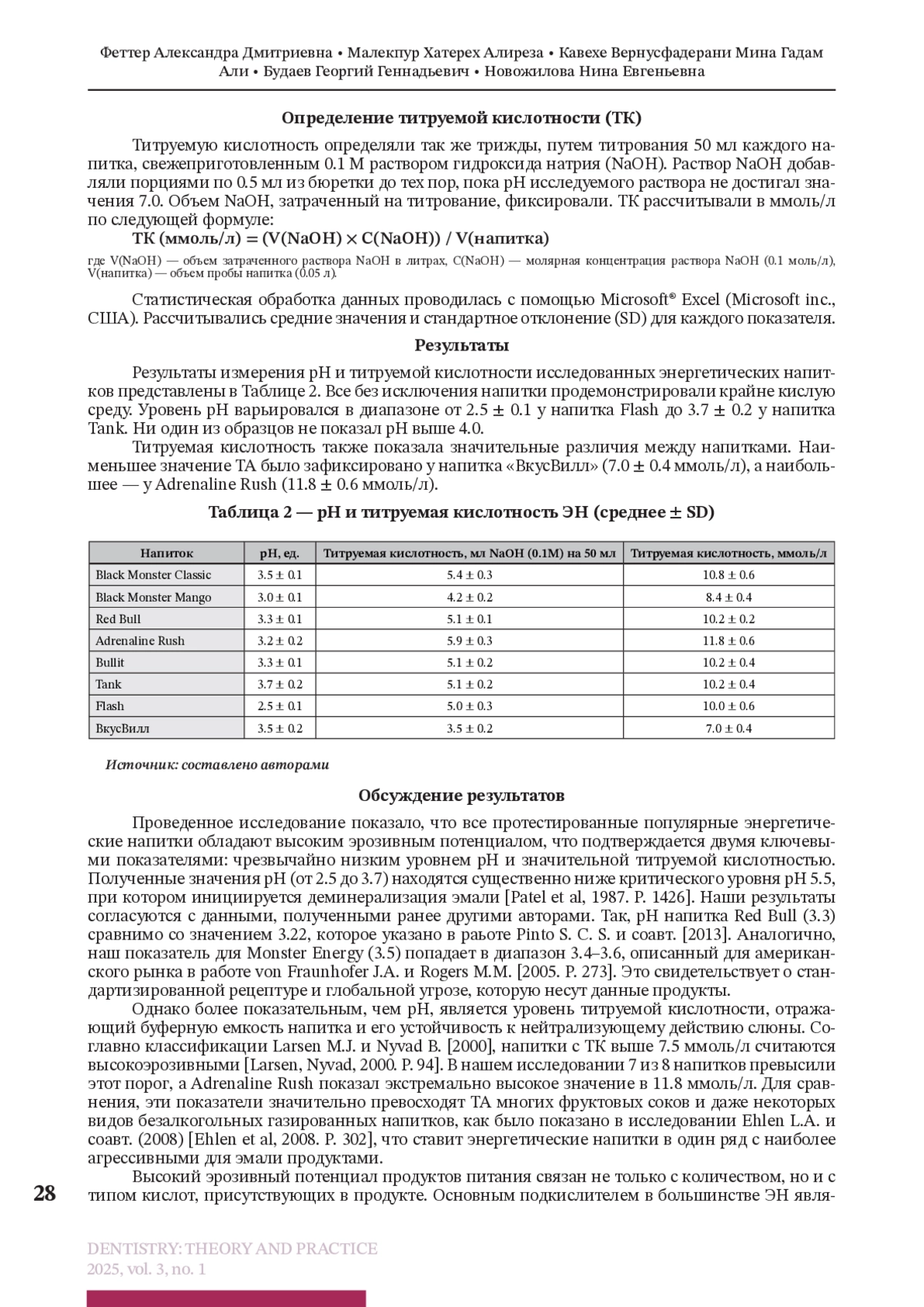 Актуальность: Потребление энергетических напитков неуклонно растет, что вызывает обеспокоенность относительно их влияния на здоровье полости рта, в частности на риск развития эрозии твердых тканей зубов. Эрозивный потенциал напитка определяется не только его кислотностью (pH), но и его способностью противостоять нейтрализующему действию слюны, то есть титруемой кислотностью. Целью настоящего исследования было оценить in vitro эрозивный потенциал восьми популярных на российском рынке энергетических напитков путем определения уровня их водородного показателя и титруемой кислотности. Материалы и методы: Для исследования были отобраны напитки: Red Bull, Adrenaline Rush, Monster (Classic и Mango), Tank, VkusVill, Bullit и Flash. Уровень pH каждого напитка измеряли с помощью калиброванного цифрового pH-метра. Титруемую кислотность определяли путем титрования 50 мл напитка 0.1 M раствором гидроксида натрия (NaOH) до достижения нейтрального pH 7.0. Результаты пересчитывали в ммоль/л. Результаты: Все исследованные напитки продемонстрировали низкий уровень pH, варьирующийся от 2.5 ± 0.1 (Flash) до 3.7 ± 0.2 (Tank), что значительно ниже критического уровня для деминерализации эмали (pH 5.5). Титруемая кислотность находилась в диапазоне от 7.0 ± 0.4 ммоль/л (VkusVill) до 11.8 ± 0.6 ммоль/л (Adrenaline Rush). Выводы: Популярные энергетические напитки обладают высоким эрозивным потенциалом из-за сочетания крайне низкой кислотности и значительной титруемой кислотности. Эти характеристики указывают на высокий риск развития эрозии эмали при их частом употреблении.
