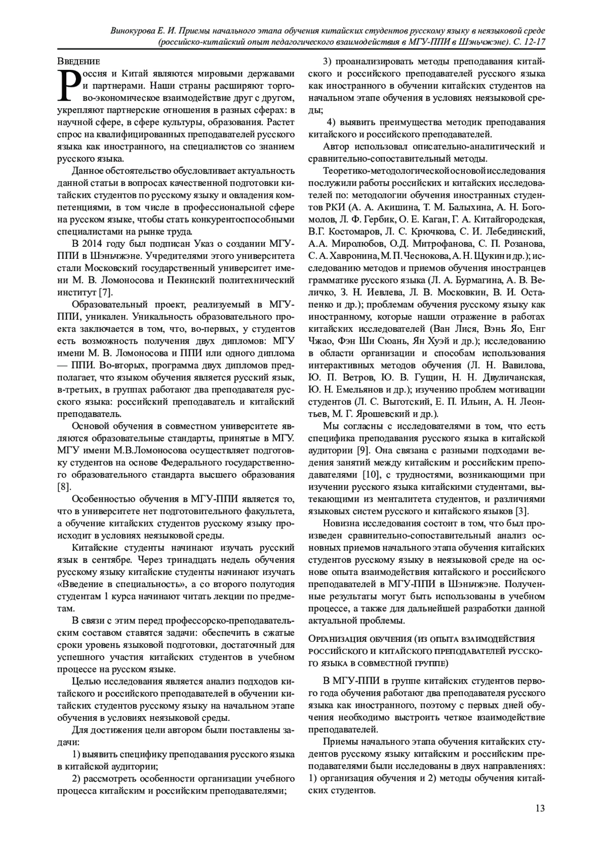 Целью исследования является анализ приемов обучения китайских студентов русскому языку на начальном этапе обучения в неязыковой среде на основе опыта взаимодействия китайского и российского преподавателей МГУ-ППИ в Шэньчжэне.