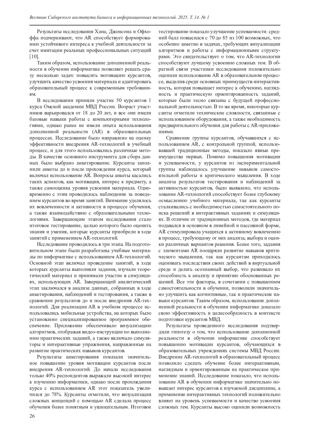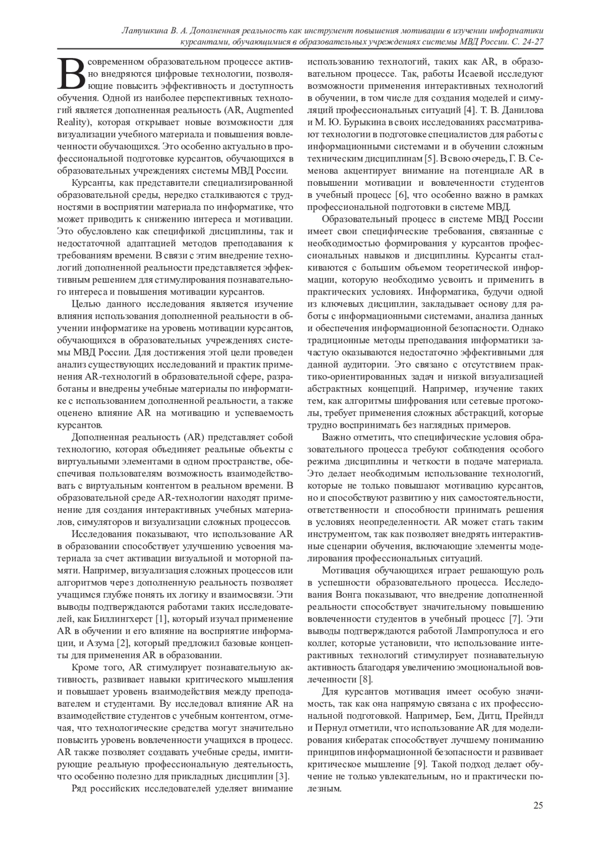 В статье рассматривается влияние технологий дополненной реальности на мотивацию курсантов, обучающихся в образовательных учреждениях системы МВД России, при обучении информатике. Технологии дополненной реальности помогают адаптировать сложный теоретический материал к практическим задачам, что способствует более глубокому усвоению знаний и повышению уровня вовлеченности. Анализ исследований в области применения дополненной реальности в образовательной среде показывает, что ее преимущества включают наглядность, интерактивность и персонализацию. Проведенное исследование включает разработку учебных материалов с использованием дополненной реальности, а также оценку их влияния на мотивацию курсантов. Результаты эксперимента демонстрируют, что дополненная реальность стимулирует активное участие обучающихся, улучшает их успеваемость и формирует устойчивый интерес к предмету. Выводы подчеркивают важность интеграции современных технологий в образовательный процесс для повышения качества профессиональной подготовки курсантов, обучающихся в образовательных учреждениях системы МВД России. Практическая значимость работы заключается в возможности масштабного внедрения AR-технологий для модернизации обучения в специализированных учреждениях.