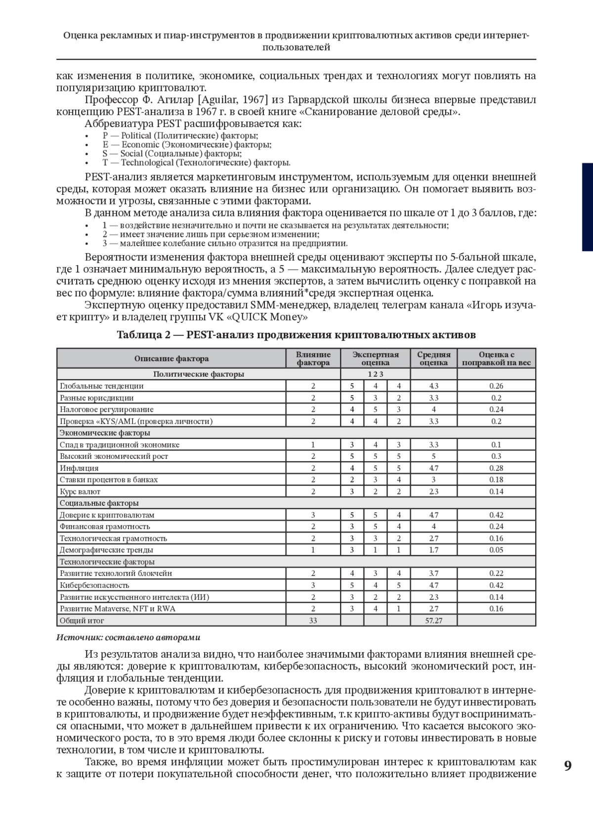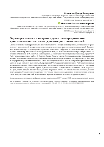 Статья посвящена оценке рекламных и пиар-инструментов в продвижении криптовалютных активов среди интернет-пользователей продвижения криптовалютных активов среди интернет-пользователей. В условиях стремительного роста крипторынка и растущего интереса к цифровым активам, ключевую роль играет правильный выбор маркетинговых инструментов и методов. В теоретической части рассматриваются: теория коммуникации по Х. Лассуэлу, мотивации по А. Маслоу, теория позиционирования по Д. Трауту и Э. Райсу и теория разумного выбора А. Смита и Джона Стюарта Милля. В ходе исследования было выявлено, что необходимо использовать широкий спектр форм анализа продвижения в интернете из-за быстрого и непрерывного развития технологий. Также в исследовании было проанализировано криптовалютных активов среди интернет-пользователей, проведены SWOT, сравнительный анализ, PEST-анализ показал, что макросреда создает благоприятные условия для продвижения криптовалютных активов, и в настоящее время возможности превышают угрозы. В результате данных, полученных после анализа, были разработаны цель, задачи для дальнейшего исследования. В процессе работы все аспекты были выполнены, а также подтверждены. В заключении говорится о том, что для успешного продвижения криптовалютных активов среди интернет-пользователей нужно понимать рынок, цифровые активы, инструменты рынка.