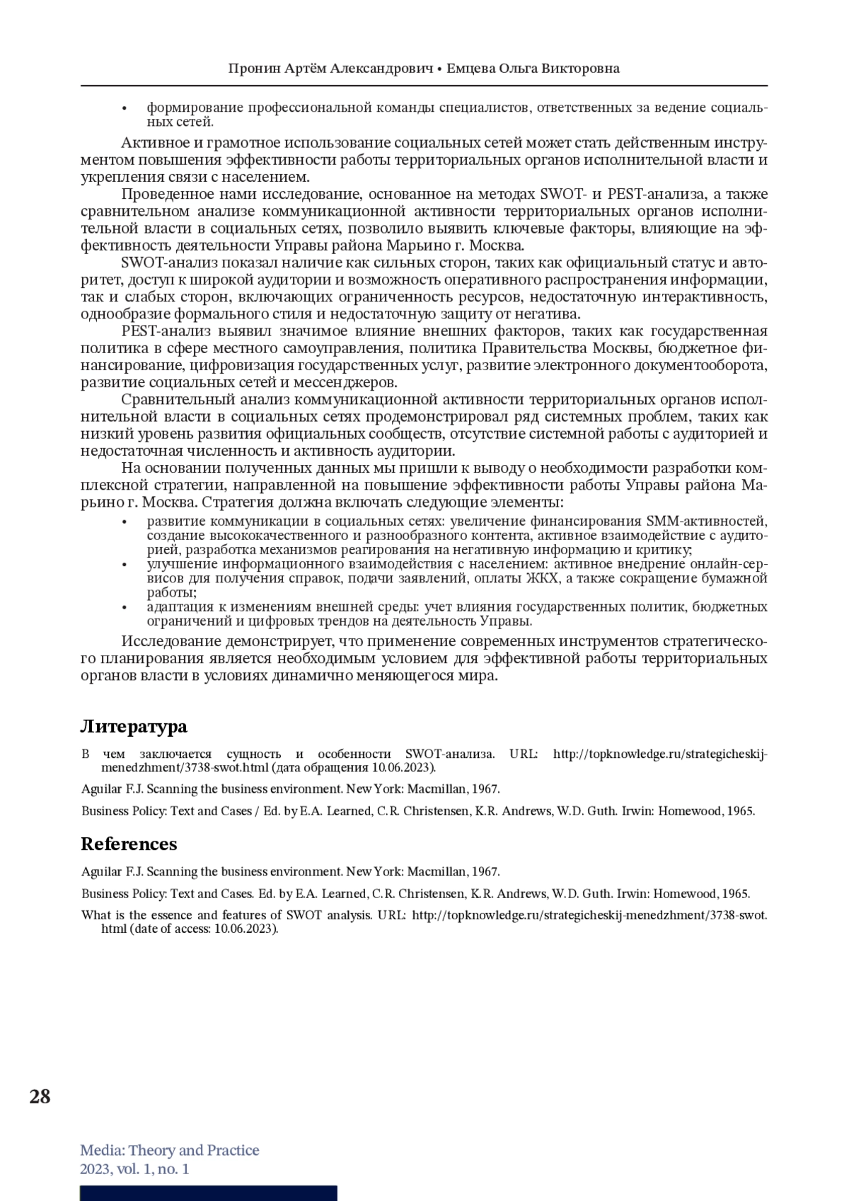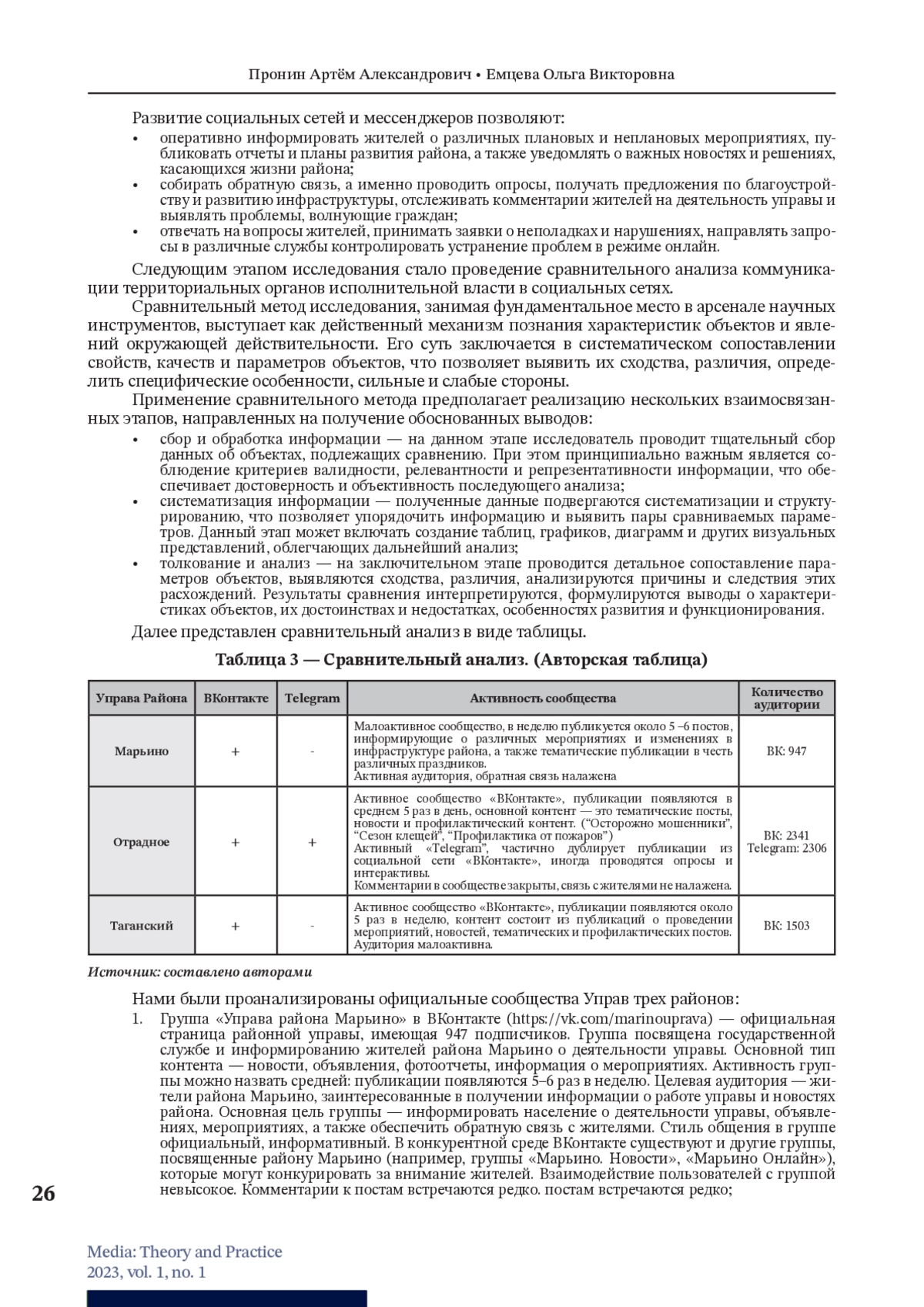 В данной статье описан процесс проведения исследования, направленного на сравнительный анализ подходов к разработке инструментов коммуникации посредством социальных сетей территориальных органов исполнительной власти. Проведенное нами исследование, основанное на методах SWOT- и PEST-анализа, а также сравнительном анализе коммуникационной активности территориальных органов исполнительной власти в социальных сетях, позволило выявить ключевые факторы, влияющие на эффективность деятельности Управы района Марьино г. Москва. SWOT-анализ показал наличие как сильных сторон, таких как официальный статус и авторитет, доступ к широкой аудитории и возможность оперативного распространения информации, так и слабых сторон, включающих ограниченность ресурсов, недостаточную интерактивность, однообразие формального стиля и недостаточную защиту от негатива. PEST-анализ выявил значимое влияние внешних факторов, таких как государственная политика в сфере местного самоуправления, политика Правительства Москвы, бюджетное финансирование, цифровизация государственных услуг, развитие электронного документооборота, развитие социальных сетей и мессенджеров. Сравнительный анализ коммуникационной активности территориальных органов исполнительной власти в социальных сетях продемонстрировал ряд системных проблем, таких как низкий уровень развития официальных сообществ, отсутствие системной работы с аудиторией и недостаточная численность и активность аудитории. На основании полученных данных мы пришли к выводу о необходимости разработки комплексной стратегии, направленной на повышение эффективности работы Управы района Марьино г. Москва.