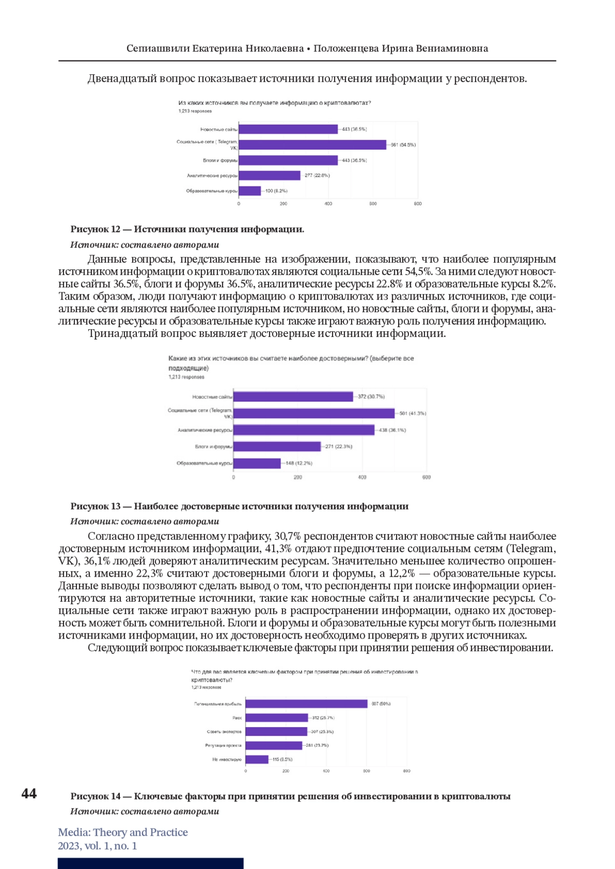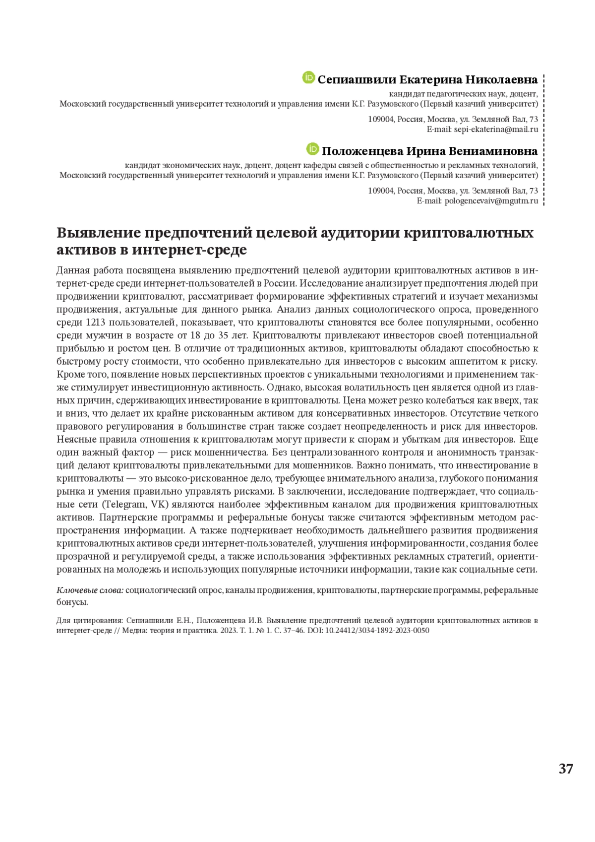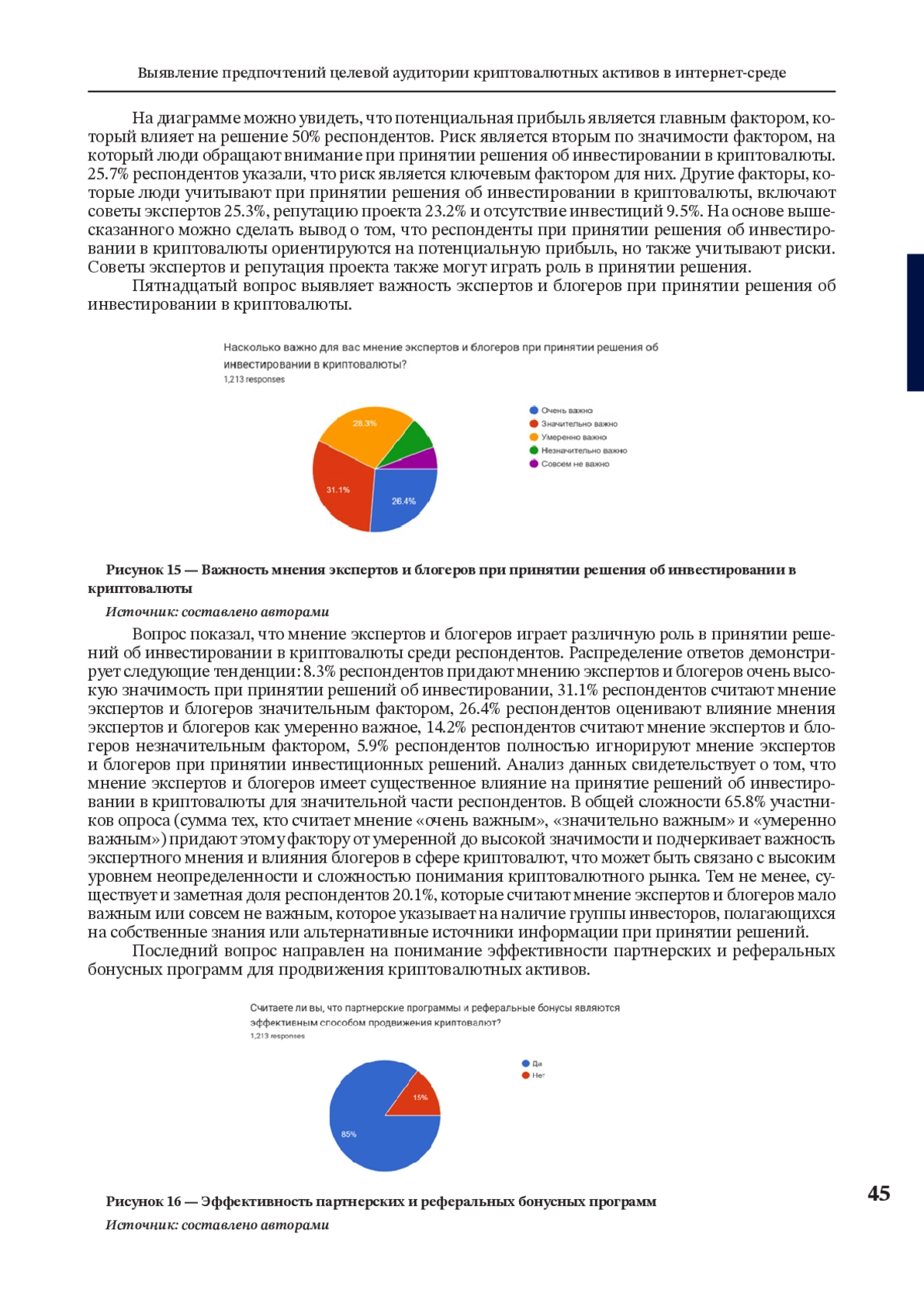Данная работа посвящена выявлению предпочтений целевой аудитории криптовалютных активов в интернет-среде среди интернет-пользователей в России. Исследование анализирует предпочтения людей при продвижении криптовалют, рассматривает формирование эффективных стратегий и изучает механизмы продвижения, актуальные для данного рынка. Анализ данных социологического опроса, проведенного среди 1213 пользователей, показывает, что криптовалюты становятся все более популярными, особенно среди мужчин в возрасте от 18 до 35 лет. Криптовалюты привлекают инвесторов своей потенциальной прибылью и ростом цен. В отличие от традиционных активов, криптовалюты обладают способностью к быстрому росту стоимости, что особенно привлекательно для инвесторов с высоким аппетитом к риску. Кроме того, появление новых перспективных проектов с уникальными технологиями и применением также стимулирует инвестиционную активность. Однако, высокая волатильность цен является одной из главных причин, сдерживающих инвестирование в криптовалюты. Цена может резко колебаться как вверх, так и вниз, что делает их крайне рискованным активом для консервативных инвесторов. Отсутствие четкого правового регулирования в большинстве стран также создает неопределенность и риск для инвесторов. Неясные правила отношения к криптовалютам могут привести к спорам и убыткам для инвесторов. Еще один важный фактор — риск мошенничества. Без централизованного контроля и анонимность транзакций делают криптовалюты привлекательными для мошенников. Важно понимать, что инвестирование в криптовалюты — это высоко-рискованное дело, требующее внимательного анализа, глубокого понимания рынка и умения правильно управлять рисками. В заключении, исследование подтверждает, что социальные сети (Telegram, VK) являются наиболее эффективным каналом для продвижения криптовалютных активов. Партнерские программы и реферальные бонусы также считаются эффективным методом распространения информации. А также подчеркивает необходимость дальнейшего развития продвижения криптовалютных активов среди интернет-пользователей, улучшения информированности, создания более прозрачной и регулируемой среды, а также использования эффективных рекламных стратегий, ориентированных на молодежь и использующих популярные источники информации, такие как социальные сети.
