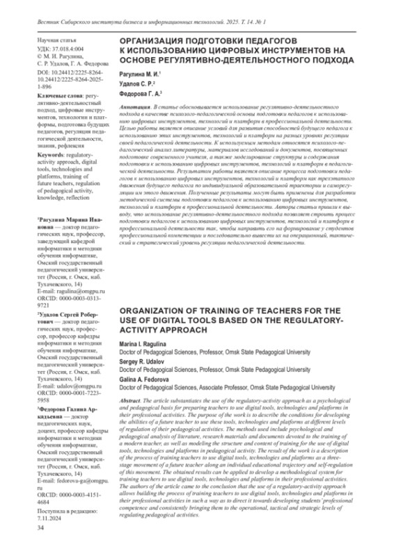 В статье обосновывается использование регулятивно-деятельностного подхода в качестве психолого-педагогической основы подготовки педагогов к использованию цифровых инструментов, технологий и платформ в профессиональной деятельности. Целью работы является описание условий для развития способностей будущего педагога к использованию этих инструментов, технологий и платформ на разных уровнях регуляции своей педагогической деятельности. К используемым методам относятся психолого-педагогический анализ литературы, материалов исследований и документов, посвященных подготовке современного учителя, а также моделирование структуры и содержания подготовки к использованию цифровых инструментов, технологий и платформ в педагогической деятельности. Результатом работы является описание процесса подготовки педагогов к использованию цифровых инструментов, технологий и платформ как трехэтапного движения будущего педагога по индивидуальной образовательной траектории и саморегуляции им этого движения. Полученные результаты могут быть применены для разработки методической системы подготовки педагогов к использованию цифровых инструментов, технологий и платформ в профессиональной деятельности. Авторы статьи пришли к выводу, что использование регулятивно-деятельностного подхода позволяет строить процесс подготовки педагогов к использованию цифровых инструментов, технологий и платформ в профессиональной деятельности так, чтобы направить его на формирование у студентов профессиональной компетенции и последовательно вывести их на операционный, тактический и стратегический уровень регуляции педагогической деятельности.