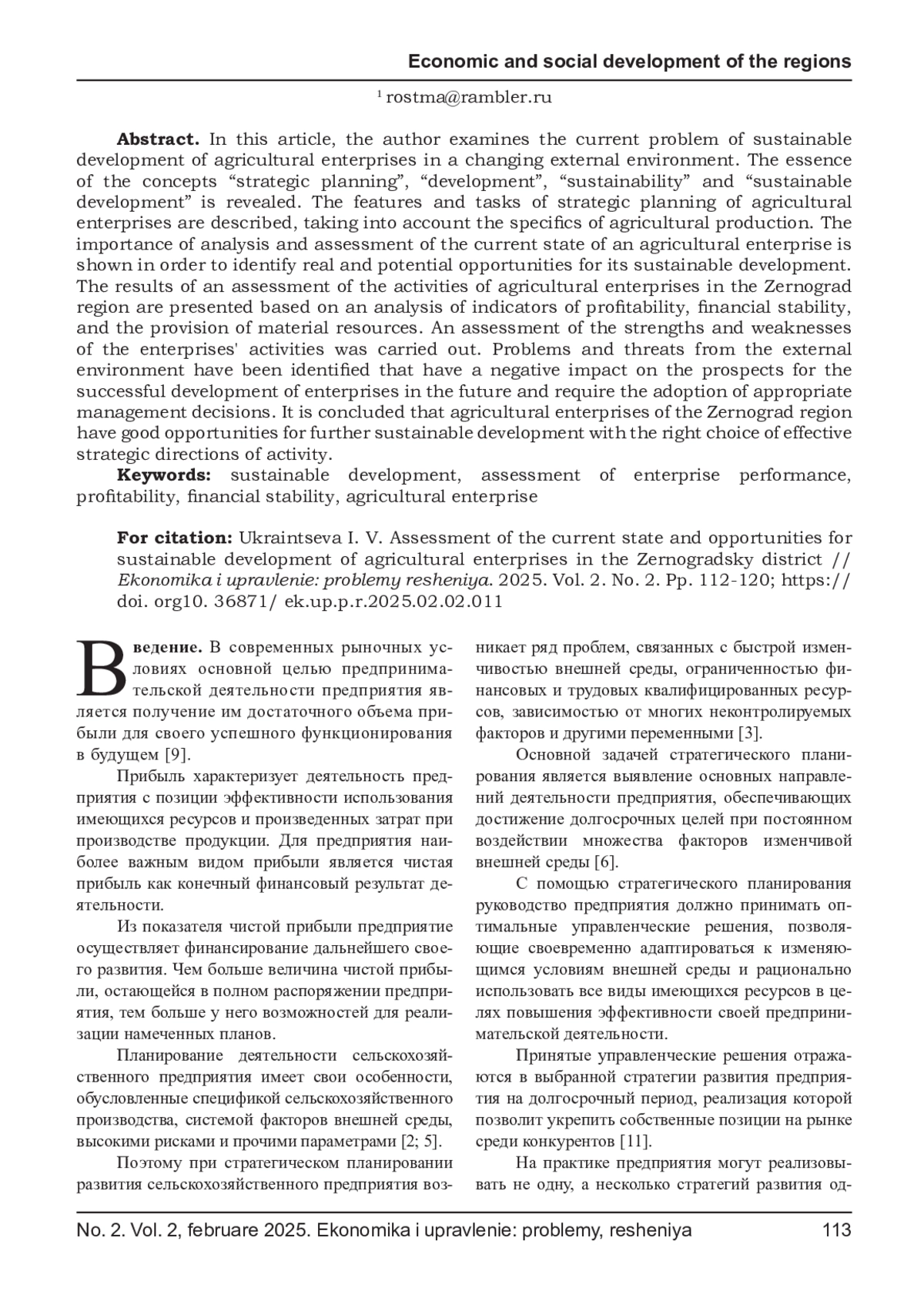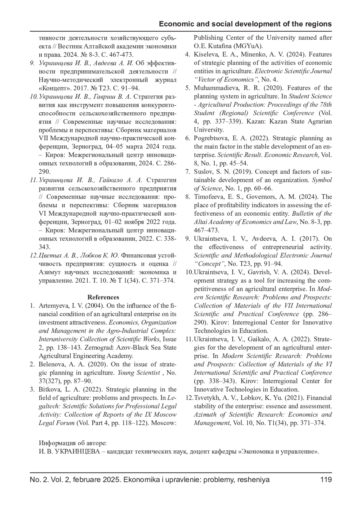 11. Украинцева И. В., Гайкало А. А. Стратегии развития сельскохозяйственного предприятия // Современные научные исследования: проблемы и перспективы: Сборник материалов VI Международной научно-практической конференции, Зерноград, 01-02 ноября 2022 года. - Киров: Межрегиональный центр инновационных технологий в образовании, 2022. С. 338343. EDN: GYTFLZ