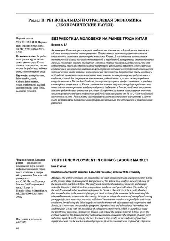В статье рассмотрены особенности занятости и безработицы молодежи в Китае на современном этапе развития. Целью статьи является проведение анализа современного состояния рынка труда молодежи Китая. В исследовании использовался теоретический анализ научной отечественной и зарубежной литературы, статистических данных, сравнение, синтез, обобщение. Автором статьи сделаны выводы о том, что для безработицы среди молодежи в Китае характерен циклический характер, обусловленный сокращением численности занятых во всех отраслях экономики в условиях наблюдающегося экономического спада страны; для сокращения численности безработных среди молодежи необходимо привлекать дополнительные инвестиции с целью расширения рабочих мест и создания условий для сокращения предложения рабочей силы; в рамках международного сотрудничества с Россией необходимо расширение программ профессиональных и учебных стажировок студентов из Китая с возможностью последующего трудоустройства, что позволит частично решить проблему кадрового дефицита в России, а в Китае сократить излишки рабочей силы; учитывая циклический характер развития национальных экономик, прогнозирование ситуации сокращения рабочей силы в возрасте от 16 до 24 лет на ближайшие несколько лет. Результаты исследования имеют практическую значимость и могут быть использованы в национальных программах социально-экономического и регионального развития.